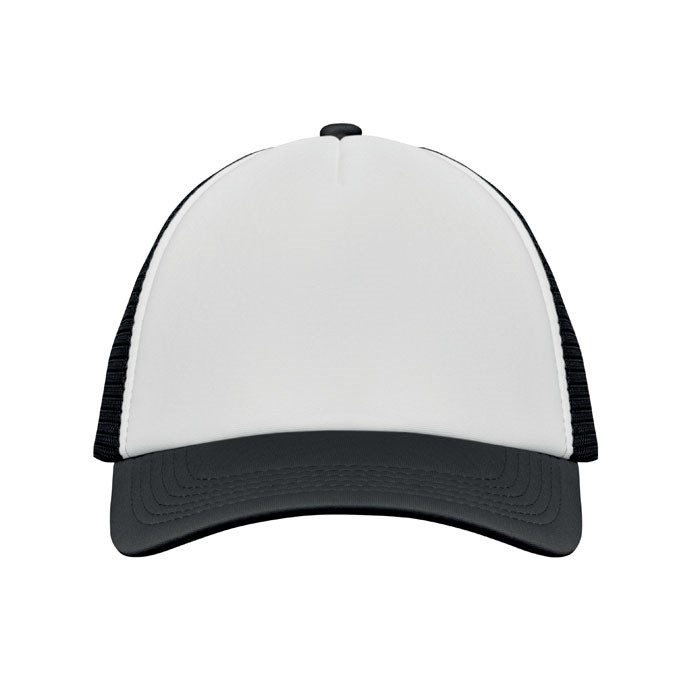 Trucker Kappe. 5 Panele. 140-150 gr/m2 Polyester. Verstellbarer Kunststoffverschluss. Weißes Frontpanel, farbiger Kappenschirm aus Polyester Jersey mit Schaum-Verstärkung. Weitere Panele aus Mesh. Größe 7 1/4.