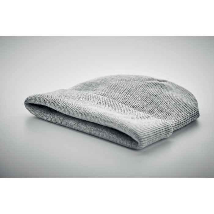 Gestrickte Beanie aus softem, elastischem RPET Polyester. Mit Umschlag. Unisex.