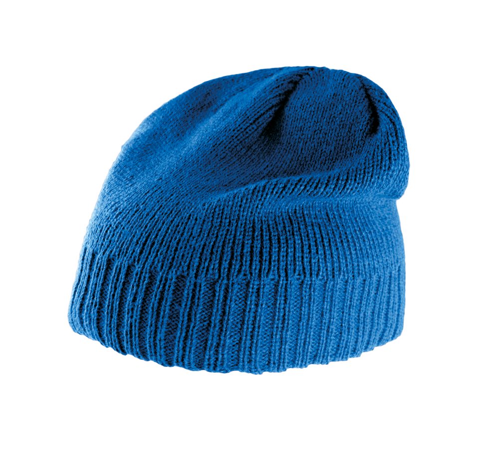 100% Acryl. Strickmütze. Rand in grobem Rippstrick.