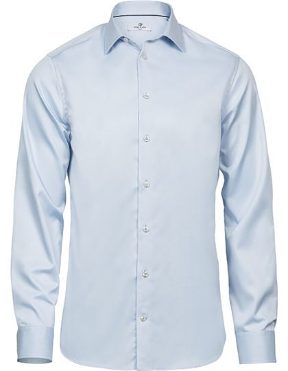 Gefärbtes Baumwollgarn, 100/2 Twill | Leichter Haifischkragen | Kragen und Bündchen nahtgeschweißt | Rückenpasse | Abnäher am Rücken | Abgerundeter Saum | Pflegeleicht (Easy Care) | Ascolite-Knopfummantelung