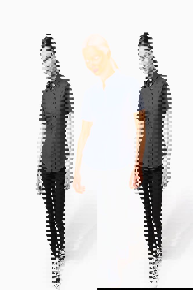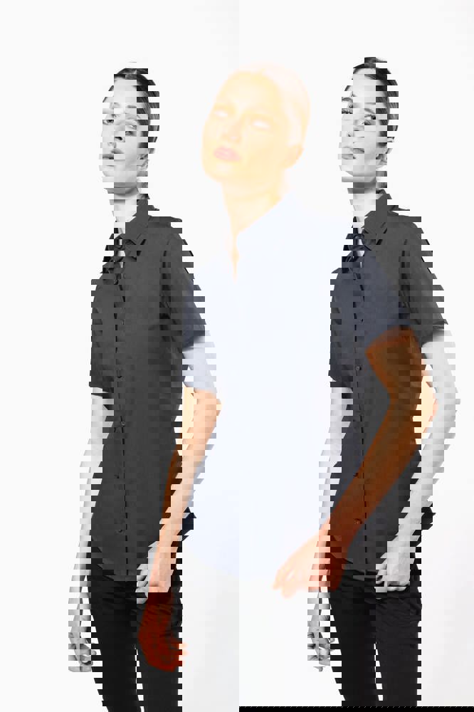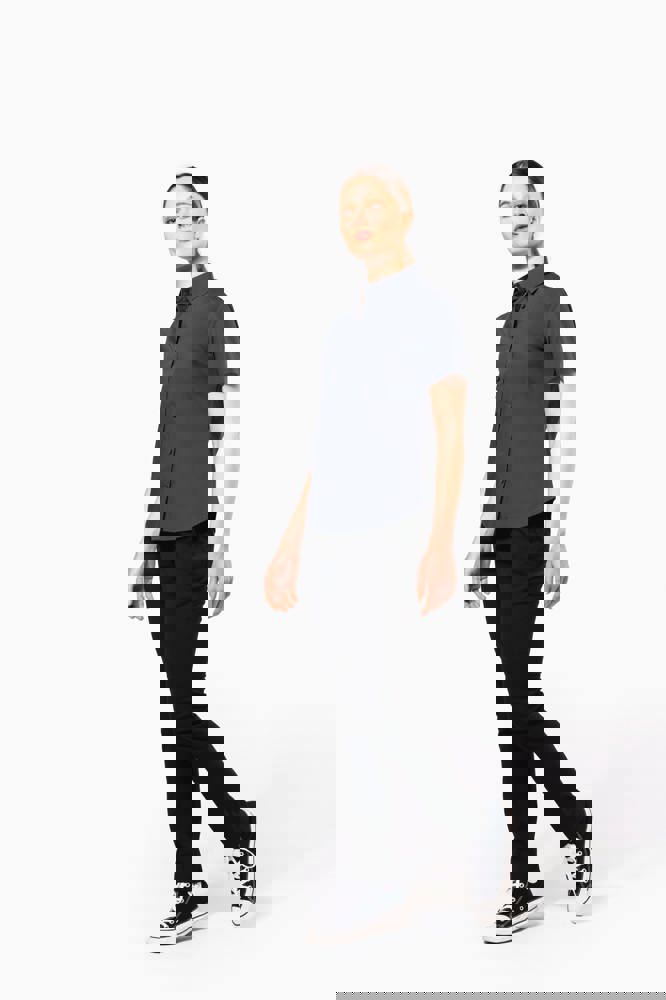 97% Baumwolle / 3% Elasthan. Körpernaher Schnitt. Klassischer, knopfloser Kragen. Farblich abgestimmte Knöpfe. Je 2 Abnäher am Rücken und auf der Vorderseite für taillierte Passform. Gefüllter Saum am Ärmelende. 1 Ersatzknopf. Abgerundeter Saum.
