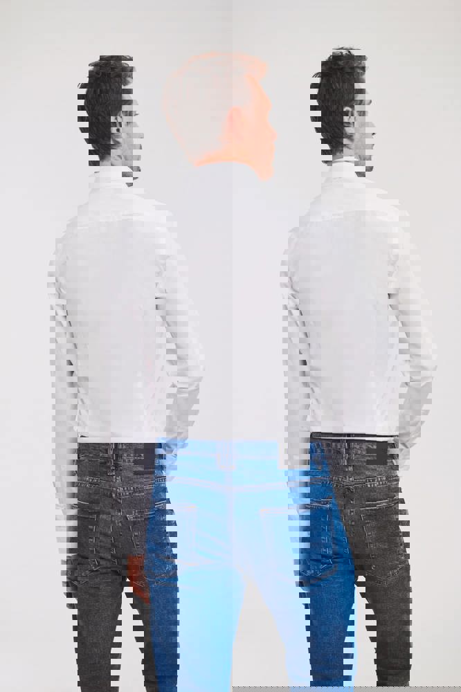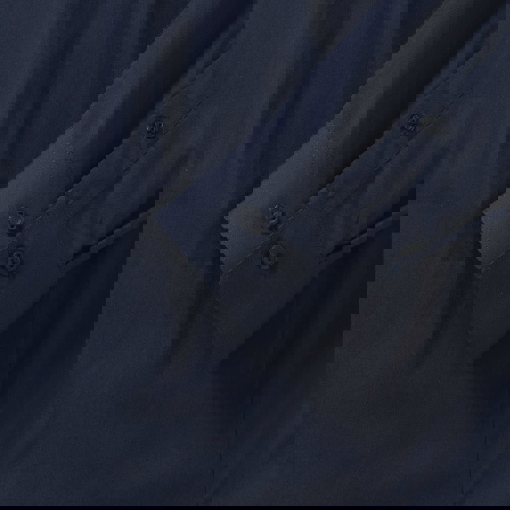 75% Baumwolle / 25% Elastomultiester-Faser (Lycra® T400®). Ausgezeichnete Formbeständigkeit für anhaltenden Sitz. Strapazierfähiger Stoff, schnelltrocknend für kühlen Komfort. Halber Cutaway-Kragen, kurze Kragenform. Schmale Knopfleiste. Eckige Manschetten (mit Manschettenknöpfen tragbar). Abnäher hinten. Körperbetonter Schnitt.