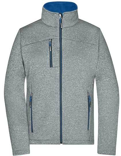 Softshelljacke in Melange-Optik | Angenehmes, weiches, 2-lagiges Softshellmaterial | Fleece-Innenseite in Kontrastfarbe | Durchgehend hinterlegter Front-Reißverschluss mit Kinnschutz | Stehkragen | Zwei seitliche Taschen und eine Brusttasche mit Reißverschluss | Leicht taillliert