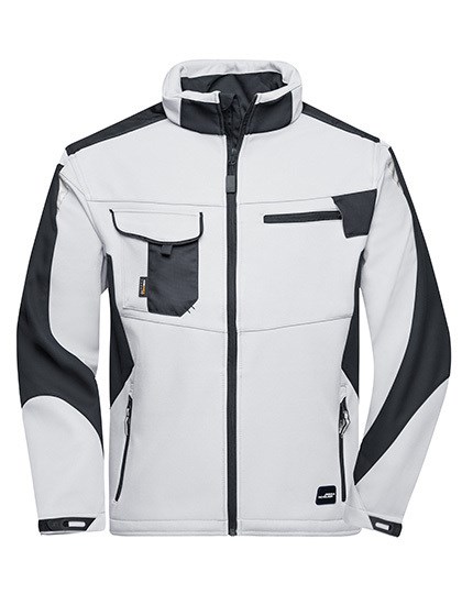 Robustes, strapazierfähiges Softshell-Material | Wind- und wasserabweisend (2.000 mm Wassersäule) | Atmungsaktiv und wasserdampfdurchlässig (2.000 g/m²/24h) | Stehkragen | Schulterbereich mit CORDURA® verstärkt | Durchgehend unterlegter Reißverschluss mit Windschutzblende | Seitentaschen und Brusttasche mit Reißverschluss | Brusttasche mit Klappe, Innentaschen | Reflektions-Elemente (ohne Schutzfunktion/keine PSA) am Arm und Rückenteil