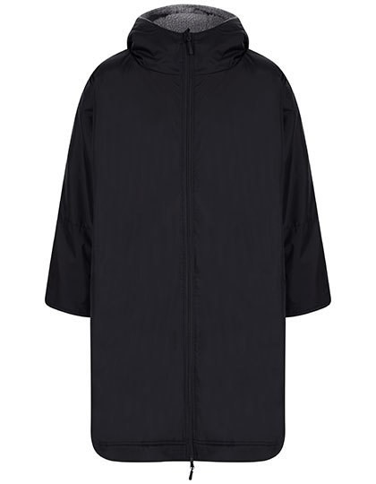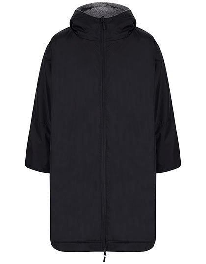 Außen: 100% Nylon 130 g/m², Innen: 100% Polyester-Sherpa-Fleece 280 g/m² | Wasserabweisendes Gewebe bis zu 4.000 mm | Hellgraues Sherpa-Fleece-Futter | Große Gestaltungsfläche | Mit Kapuze | Langärmeliges Design mit verstellbarem Klettverschluss am Armabschluss | Einheitsgröße – 104 cm Länge, 82 cm halbe Brust | Zwei, mit Mikrofleece gefütterte, Taschen vorne | Innentasche mit Reißverschluss | Aufgesetzte Tasche innen | Zwei-Wege-Reißverschluss für Bewegungsfreiheit mit Mikrofleece-Vorderseite | Ohne Logo für einfaches Umlabeln | Veredelungszugang mit verstecktem Reißverschluss