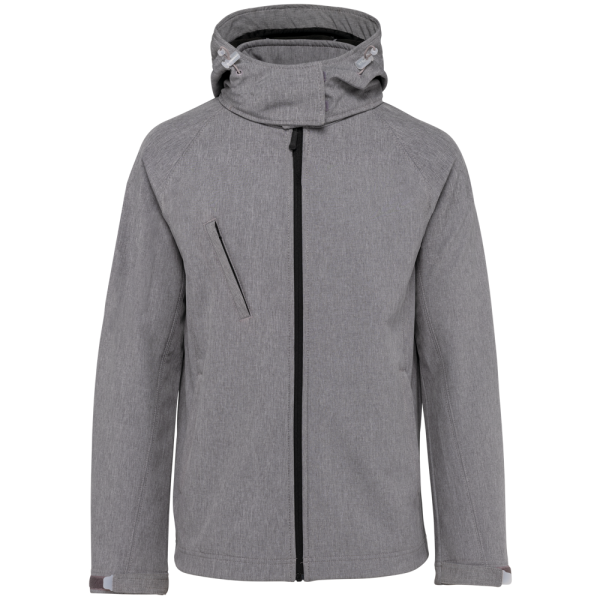 95% Polyester 5% Elasthan. 3-lagiges Verbund-Fleece. Membrantechnologie: atmungsaktiv 1000 g/m2/24h und wasserabweisend 5000 mm. Außenschicht: 95% Polyester 5% Elasthan, Mittelschicht: atmungsaktiv. Innenschicht: Polarfleece. Raglanärmel. Durchgehender Reißverschluss. 2 Vordertaschen mit Reißverschluss. 1 Brusttasche mit Reißverschluss. Ärmelverstellung mittels Klettverschlüssen. Abnehmbare Kapuze mit Klettverschluss. Kordelzug an der Kapuze. Innen unsichtbarer Reißverschluss zum Veredeln.