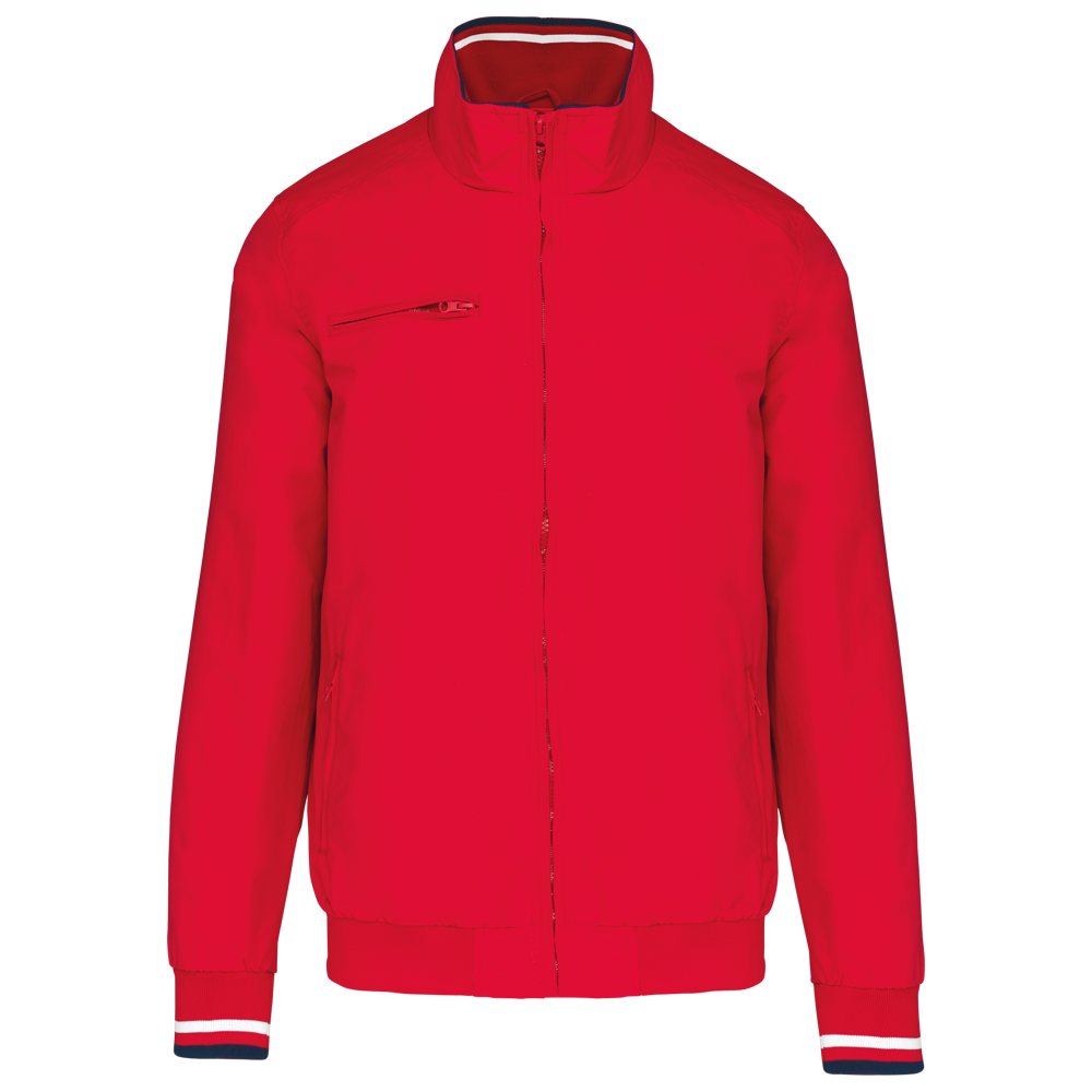 100% Polyamid Taslan Ottoman. Futter: 100% Polyester-Netzgewebe. Solides Gewebe mit Matteffekt. Zwei Fronttaschen mit Reißverschluss. Eine Brusttasche. Eine Innentasche. Kragen und Ärmel mit Kontraststreifen. Netzfutter mit Reißverschluss für leichtes Veredeln. Rippstrick am Bund einfarbig. Rippstrick an den Ärmeln in Kontrastfarbe.