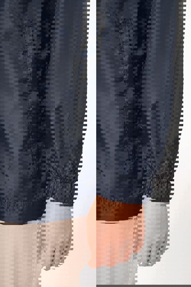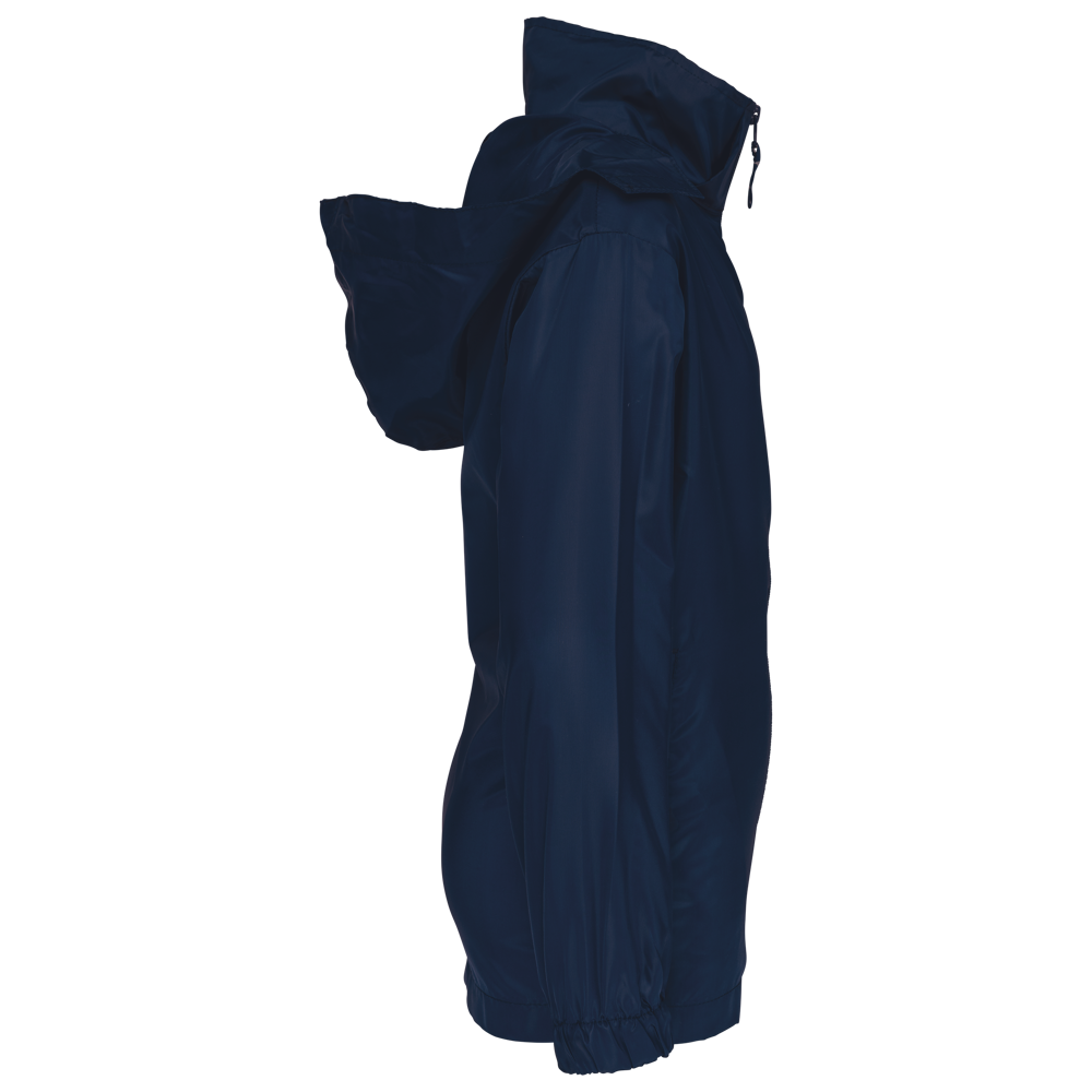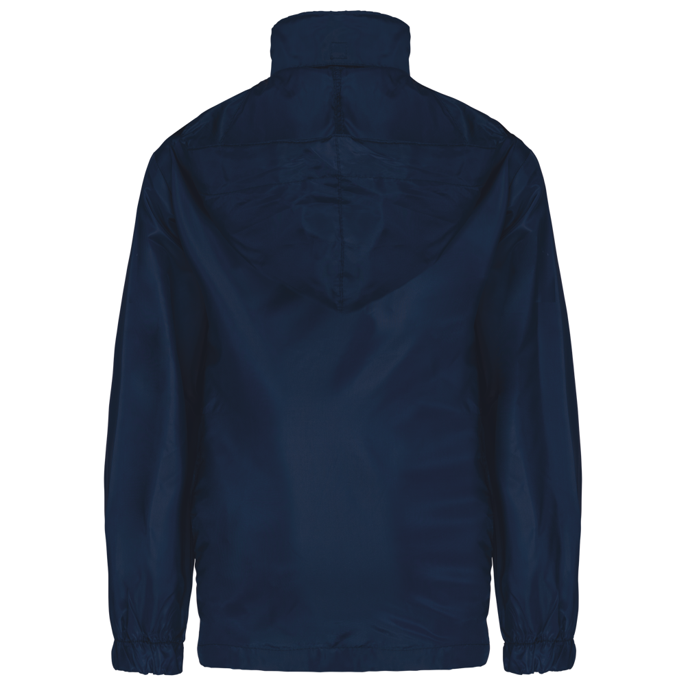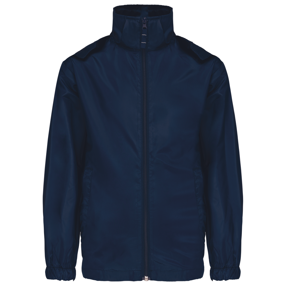 100% Polyester. Farblich abgestimmter Reißverschluss. Im Kragen verdeckte Kapuze mit Klettverschluss. 2 Fronttaschen mit Reißverschluss. Gummizug an Ärmelbund. Kann in eine Fronttasche hinein gefaltet werden (K-Way®-System).