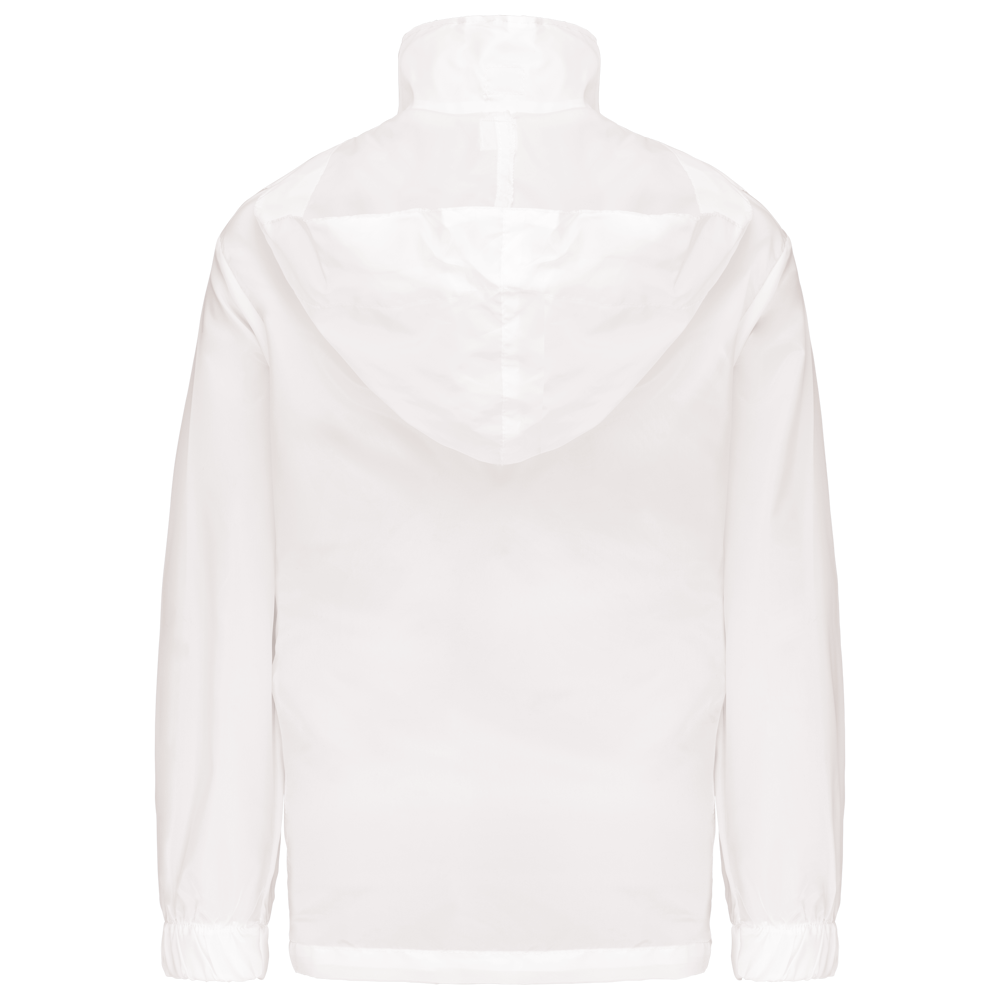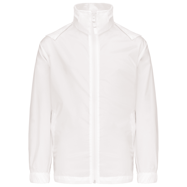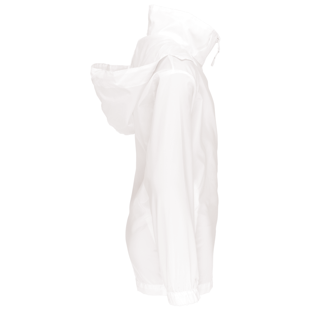100% Polyester. Farblich abgestimmter Reißverschluss. Im Kragen verdeckte Kapuze mit Klettverschluss. 2 Fronttaschen mit Reißverschluss. Gummizug an Ärmelbund. Kann in eine Fronttasche hinein gefaltet werden (K-Way®-System).