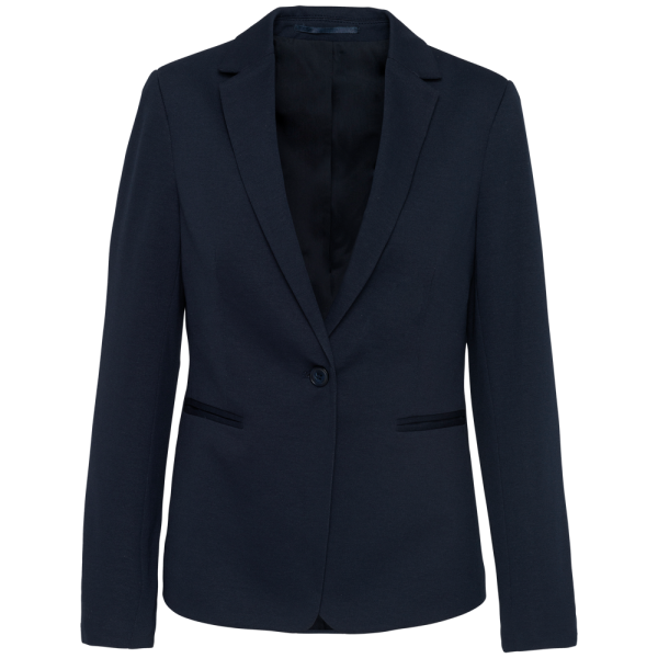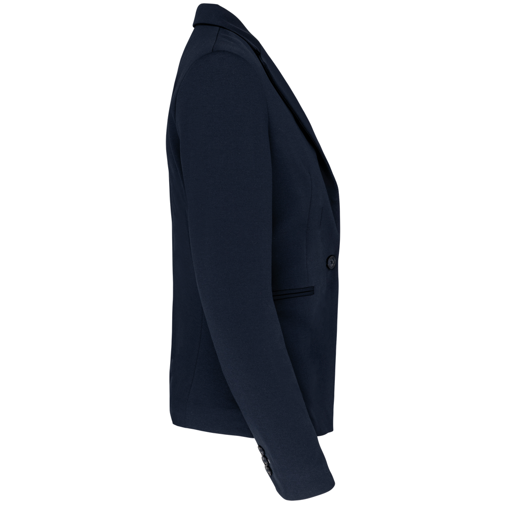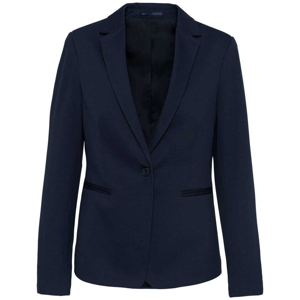 80 % Polyester / 18 % Baumwolle / 2 % Elasthan (Night Navy Heather) – 74 % Polyester / 24 % Viskose / 2 % Elasthan (Light Grey Heather). Interlock-Strick. Rumpffutter aus Baumwollpolyester und Ärmel aus Taftpolyester. Jacke mit 1 Knopf. 2 Paspeltaschen auf der Vorderseite. 1 geknöpfte Innentasche. Kontrastfarbene Paspel auf der Vorderseite innen. Ärmelbündchen mit 3 Knöpfen, davon 1 mit kontrastfarbener Knopfleiste. 1 Schlitz am Rücken. 1 unsichtbarer Reißverschluss innen links zur Veredelung.