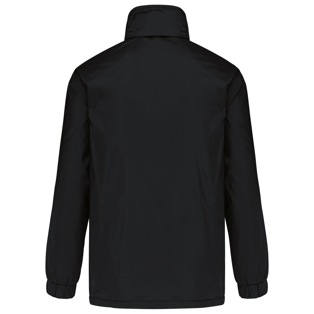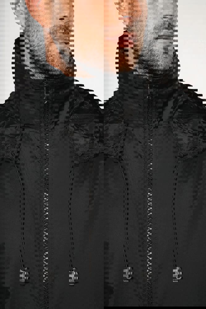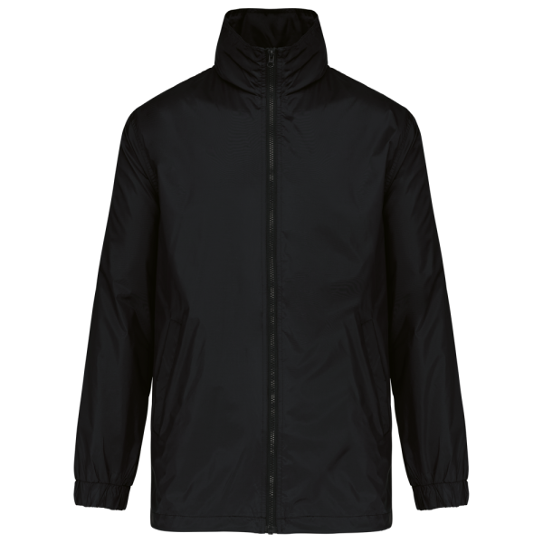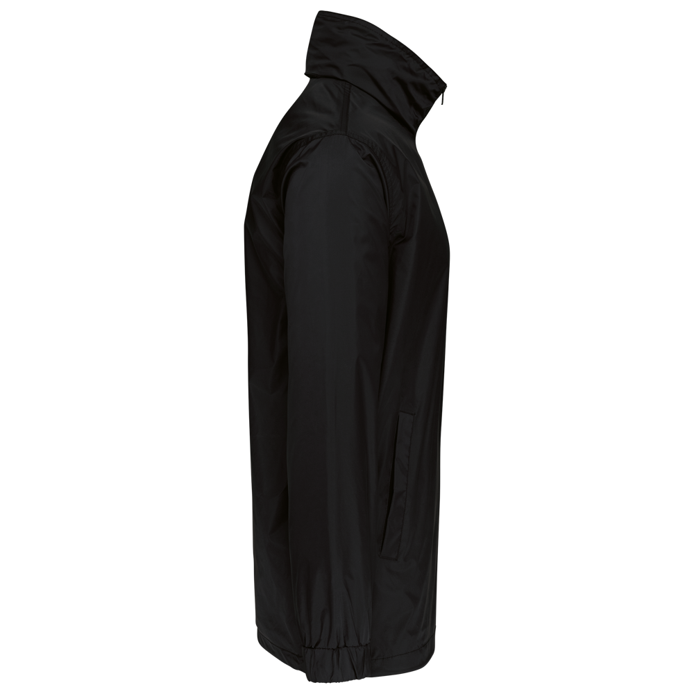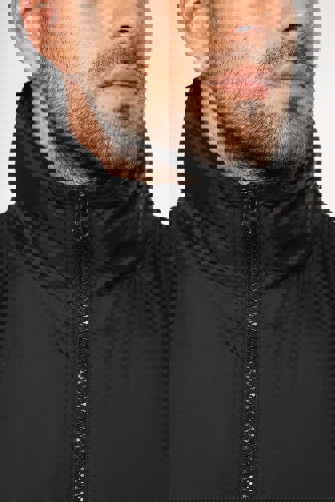 100% Polyamid 210 T mit Acrylbeschichtung innenseitig. Durchgehender Reißverschluss. 1 Innentasche + 2 Seitentaschen mit Klettverschluss. Elastischer Kordelzug mit Stoppern am Bund. Kapuze im Kragen mit Kordelzug.100% Polyester-Jersey. Futter graumeliert. Veredelungszugang an der Innenseite.