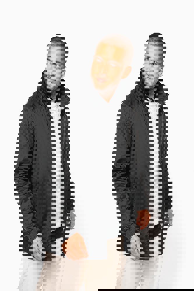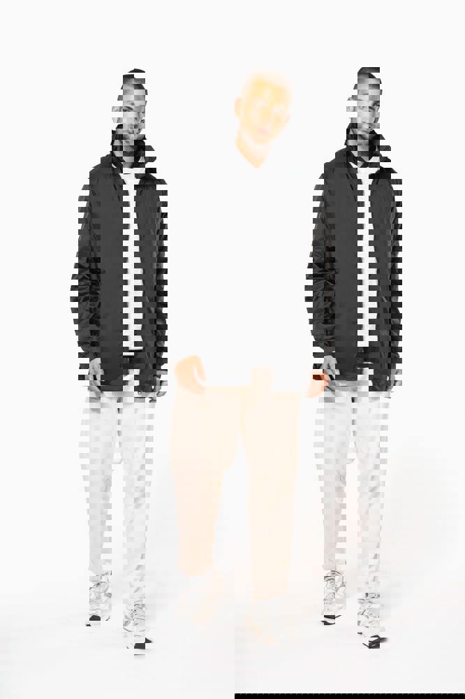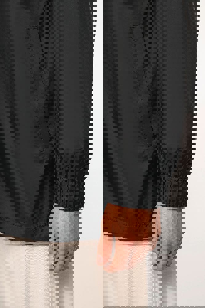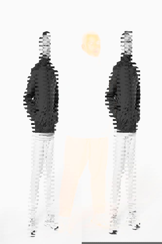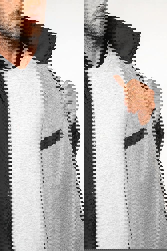 100% Polyamid 210 T mit Acrylbeschichtung innenseitig. Durchgehender Reißverschluss. 1 Innentasche + 2 Seitentaschen mit Klettverschluss. Elastischer Kordelzug mit Stoppern am Bund. Kapuze im Kragen mit Kordelzug.100% Polyester-Jersey. Futter graumeliert. Veredelungszugang an der Innenseite.