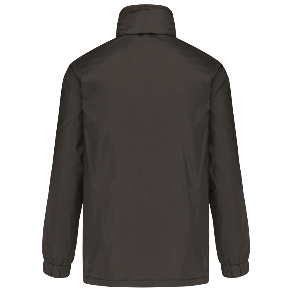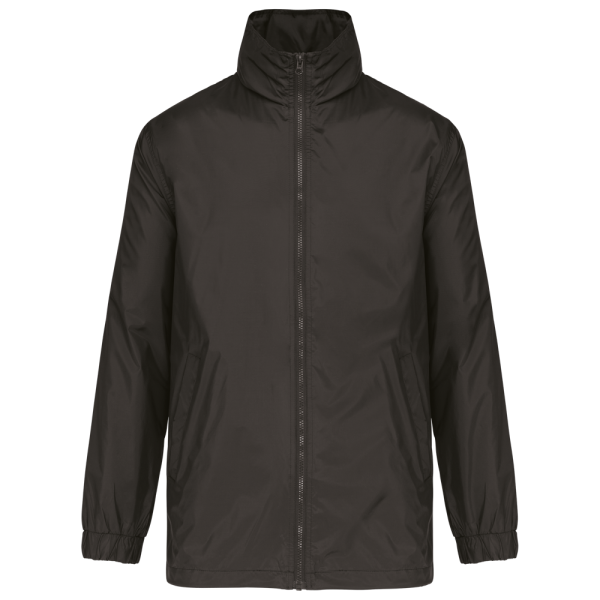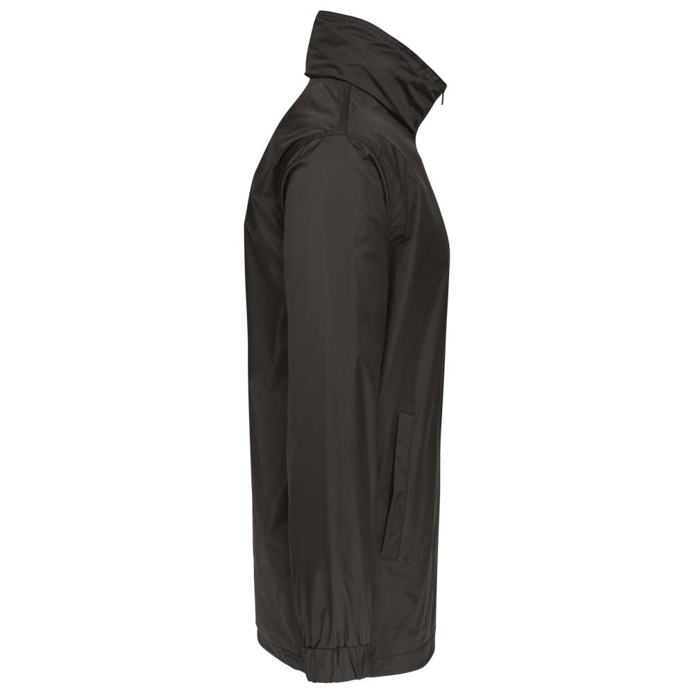 100% Polyamid 210 T mit Acrylbeschichtung innenseitig. Durchgehender Reißverschluss. 1 Innentasche + 2 Seitentaschen mit Klettverschluss. Elastischer Kordelzug mit Stoppern am Bund. Kapuze im Kragen mit Kordelzug.100% Polyester-Jersey. Futter graumeliert. Veredelungszugang an der Innenseite.