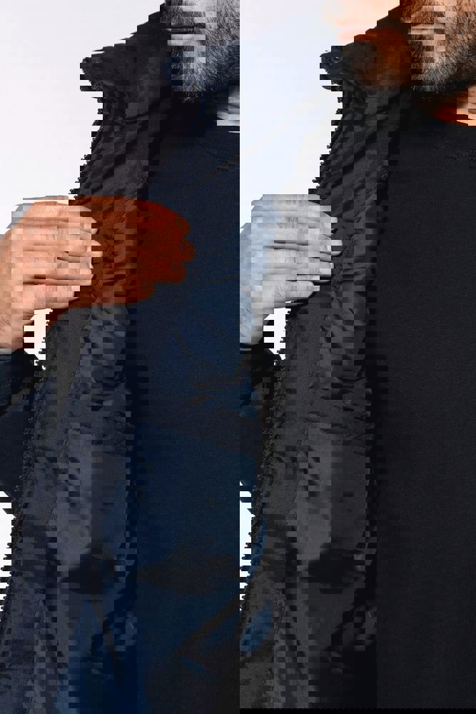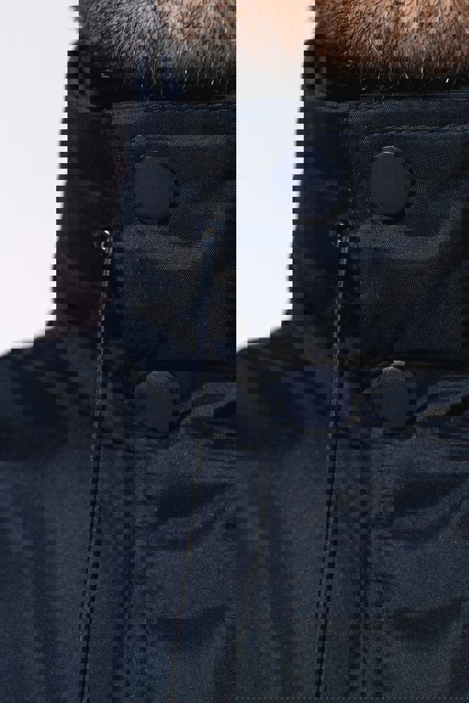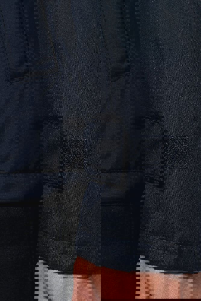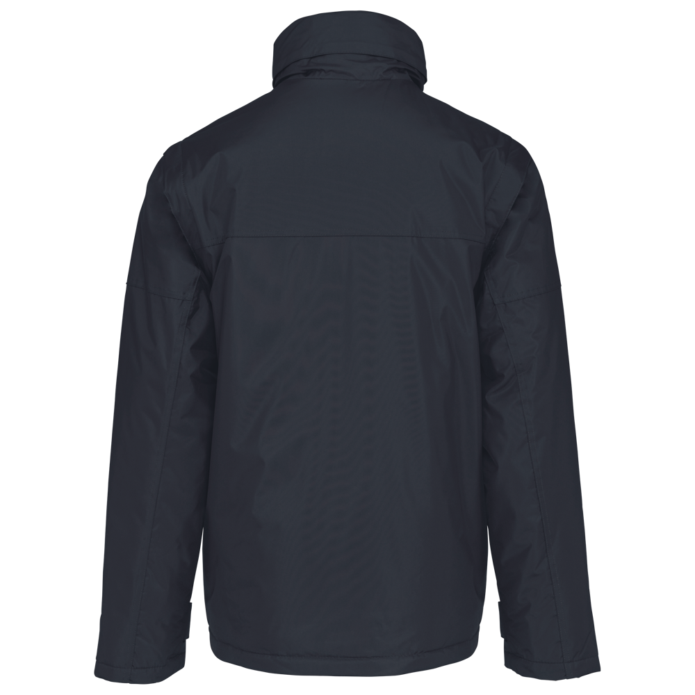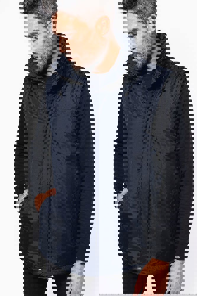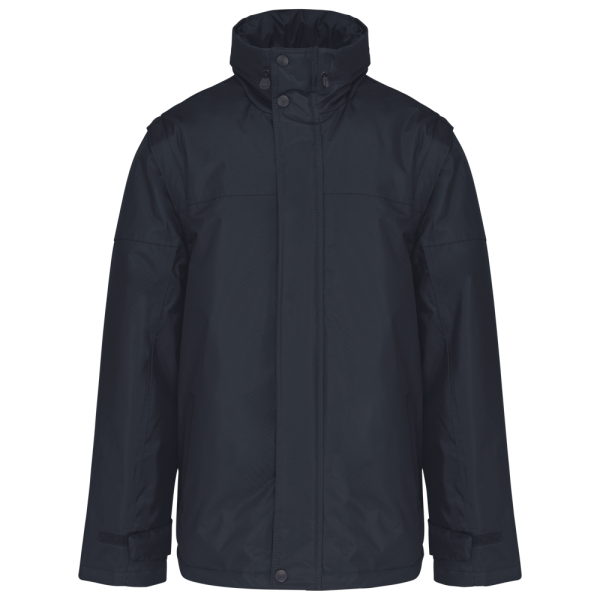 Außen: 100% Polyester PVC-Beschichtung innenseitig. Innenfutter: 100% Polyester und 100% Polyesterwattierung. Reißverschluss + Druckknopfleiste - abtrennbare Ärmel. Armabschluss mit Klettverschluss. 2 Seitentaschen. Kapuze im Kragen mit Reißverschluss. 2 Innentaschen mit Reißverschluss. 1 Handytasche. Kordelzug mit Stoppern am Bund. Zugang mittels Reißverschluss für leichtes Veredeln.