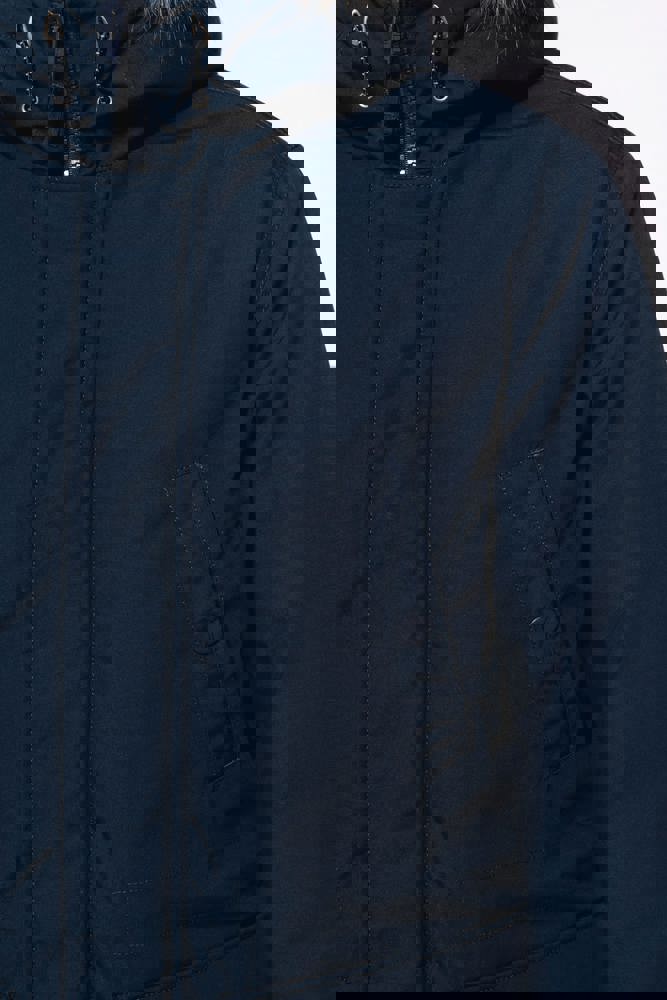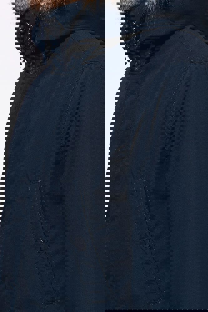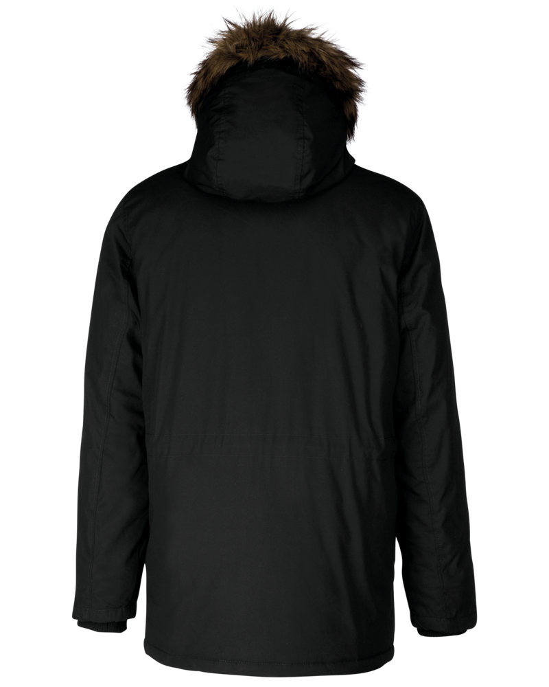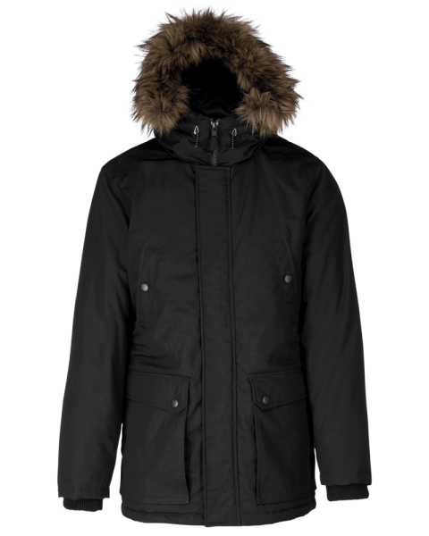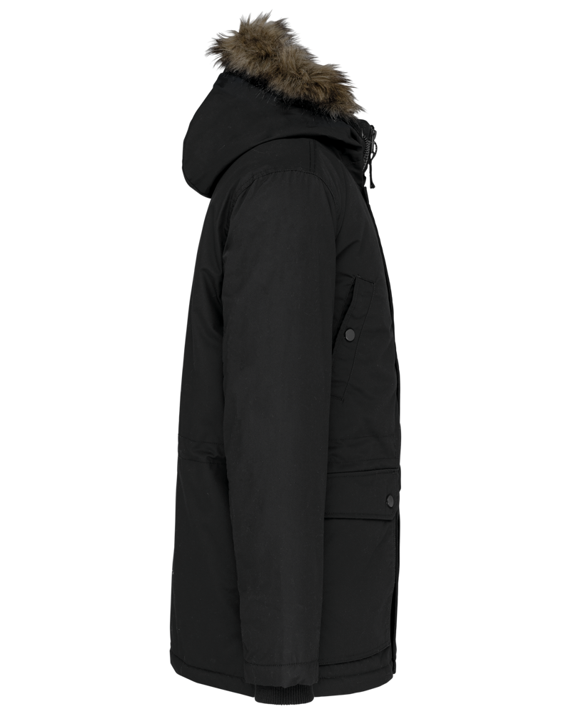 Dicker Oberstoff aus 65 % Polyester / 35 % Baumwolle. Gestepptes Futter aus 100 % Polyester. Verdeckter Reißverschluss mit Druckknopfleiste. Gefütterte, gesteppte Kapuze mit abnehmbarem Rand aus Pelzimitat. 4 Außentaschen vorne: 2 große Taschen mit doppelter Öffnung mit Druckknopfklappe und 2 gepaspelte Brusttaschen mit Druckknöpfen. 1 Innentasche mit Klettverschluss. Größe durch den innenliegenden Kordelzug verstellbar. Ärmel-Innenbündchen aus Rippstrick. 1 Reißverschluss an der Brusttasche und 1 Reißverschluss am Saum zur Veredelung.