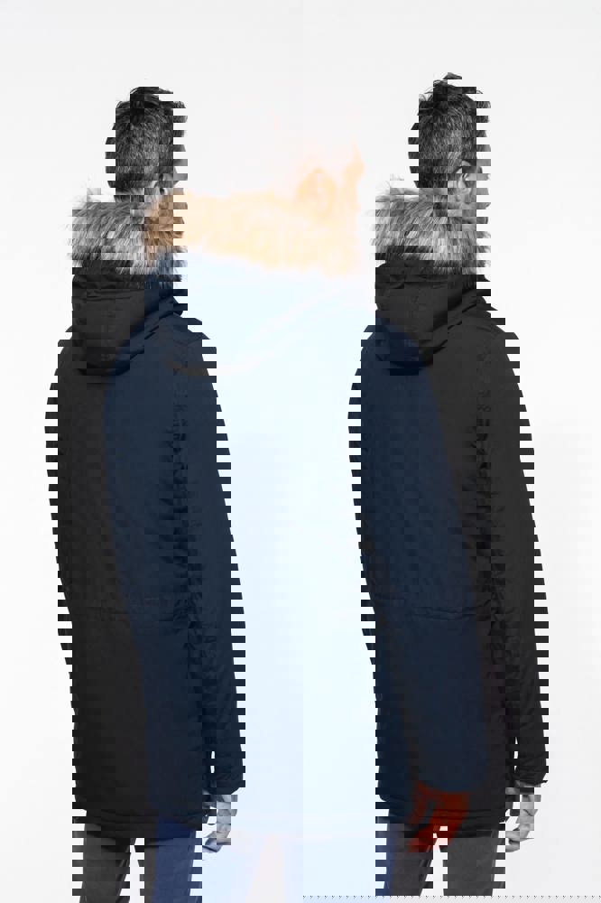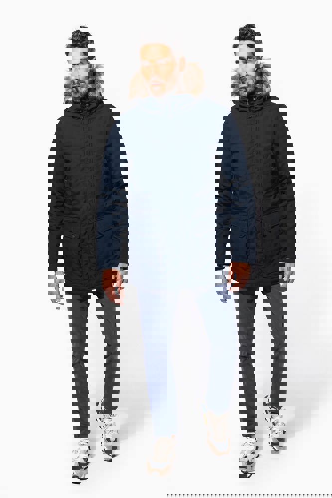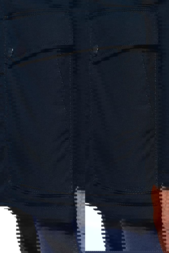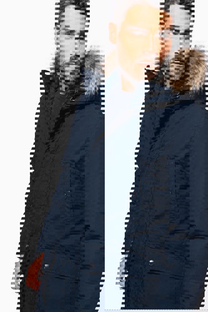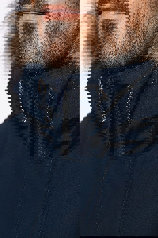 Dicker Oberstoff aus 65 % Polyester / 35 % Baumwolle. Gestepptes Futter aus 100 % Polyester. Verdeckter Reißverschluss mit Druckknopfleiste. Gefütterte, gesteppte Kapuze mit abnehmbarem Rand aus Pelzimitat. 4 Außentaschen vorne: 2 große Taschen mit doppelter Öffnung mit Druckknopfklappe und 2 gepaspelte Brusttaschen mit Druckknöpfen. 1 Innentasche mit Klettverschluss. Größe durch den innenliegenden Kordelzug verstellbar. Ärmel-Innenbündchen aus Rippstrick. 1 Reißverschluss an der Brusttasche und 1 Reißverschluss am Saum zur Veredelung.