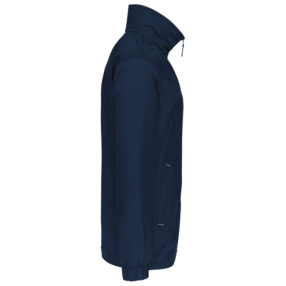 100% Polyamid 210 T mit Acrylbeschichtung. Durchgehender Reißverschluss. 2 Zipper-Taschen vorne mit kontrastierten Ziernähten. 1 Innentasche. Futter 100% Polyester: 3/4 Polyester und 1/4 Netz - wärmend aber luftig. Ärmelfutter 100% Polyester. Elastischer Kordelzug mit Stoppern am Bund. Kapuze im Kragen. Reißverschluss für leichtes Veredeln.