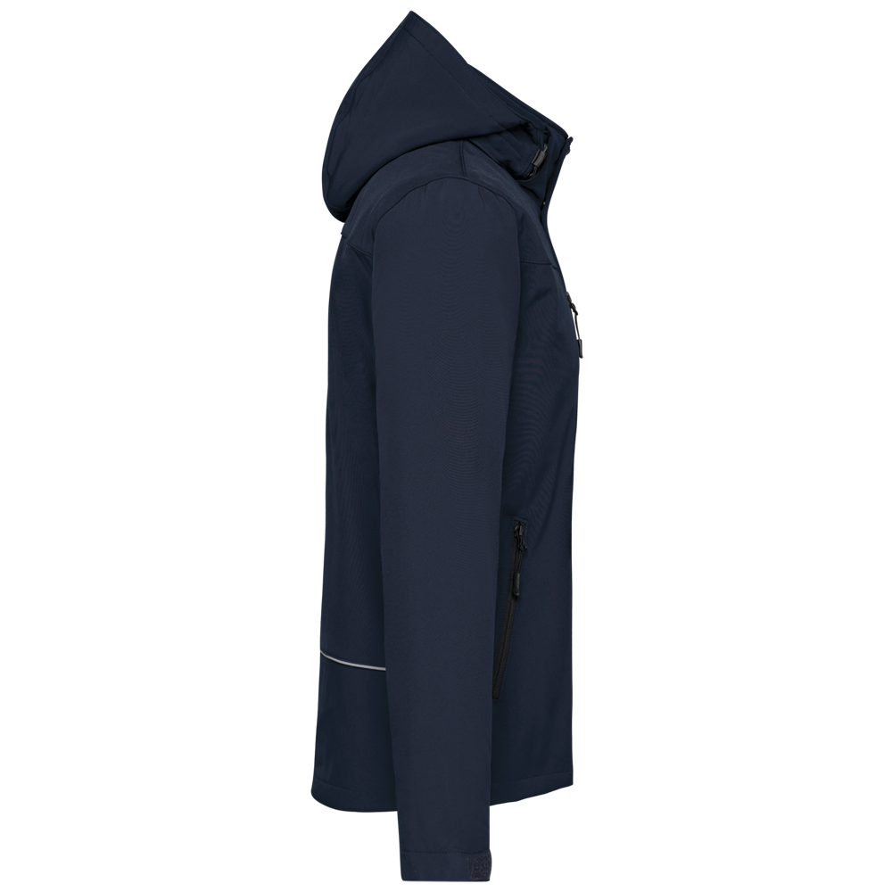 95 % Polyester / 5 % Elasthan. Dreilagiges Verbundgewebe atmungsaktiv 3.000 g/m²/24 h und wasserdicht 8.000 mm. Außenmaterial: 95 % Polyester / 5 % Elasthan. Atmungsaktive Mittelmembran. Innenschicht: Mikrofleece. Innenfutter gesteppt, 100 % Polyester. Vorderseite: 4 Reißverschlusstaschen (2 Seitentaschen, 1 am Ärmel, 1 an der rechten Brustseite). 2 Innentaschen mit Druckknopfverschluss. Abnehmbare Kapuze in 3-Bahnen-Design, gefüttert und gesteppt, Kordel mit Stoppern zum Zuziehen. Klettverschluss am Ärmel zur Weitenregulierung. 1 Reißverschluss an der Brusttasche links und 1 Reißverschluss am Saum zur Veredelung.