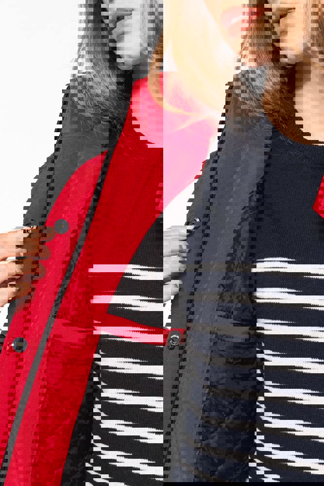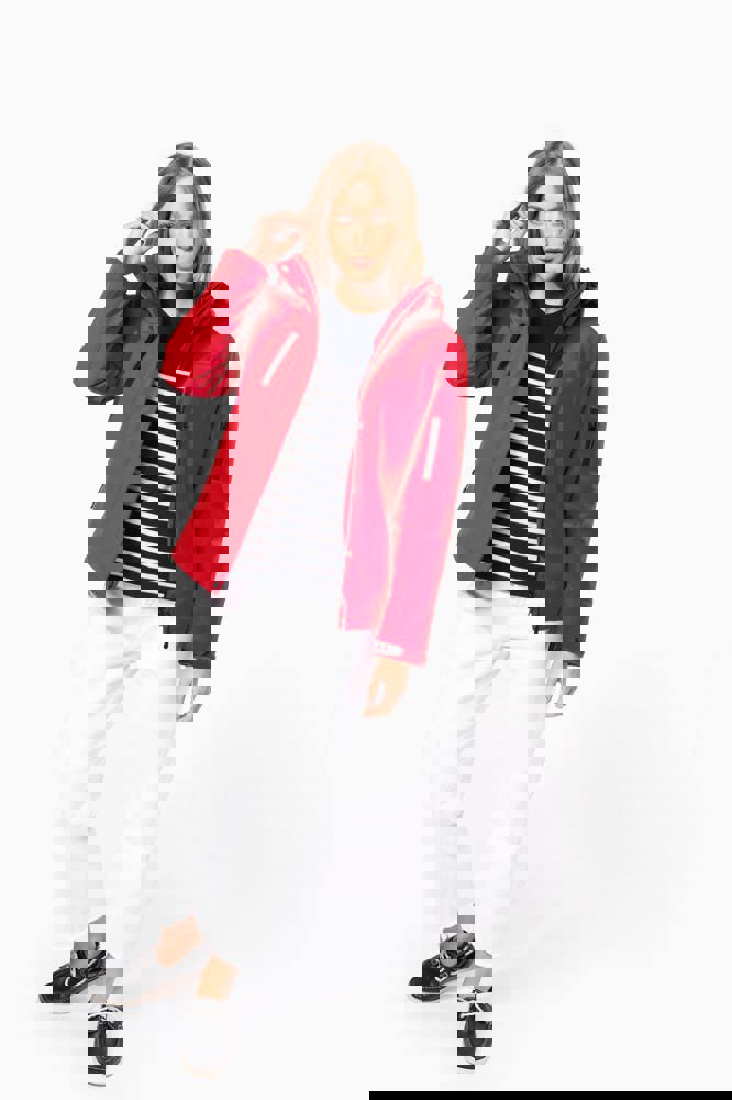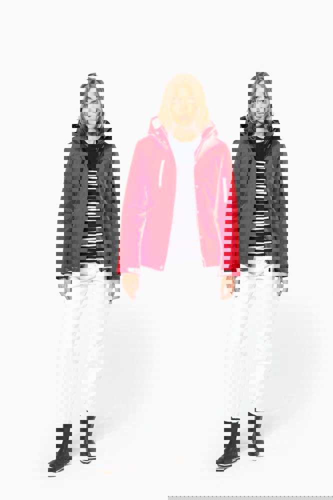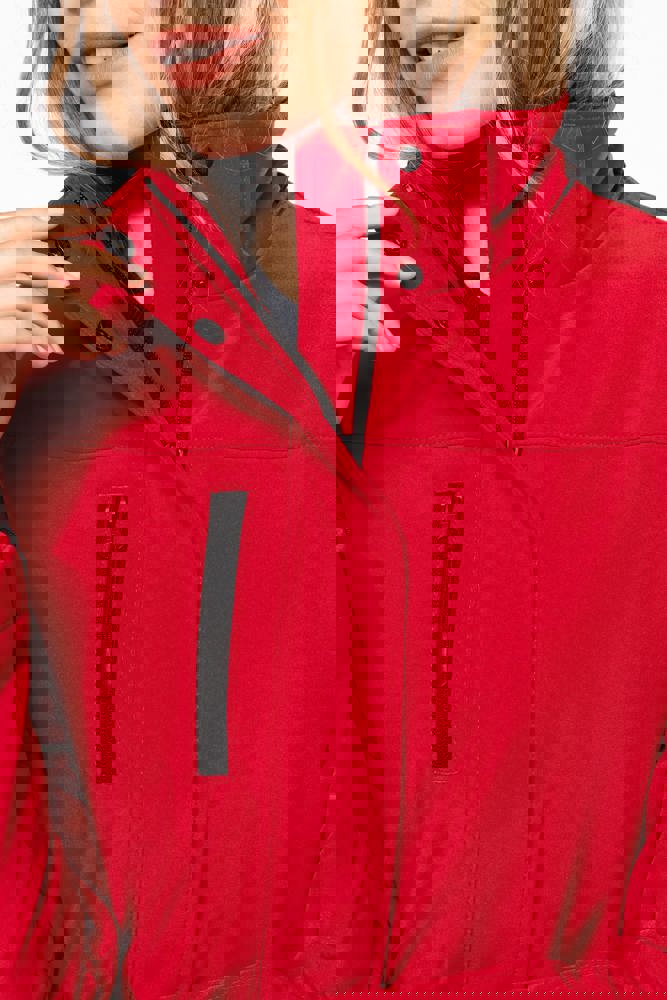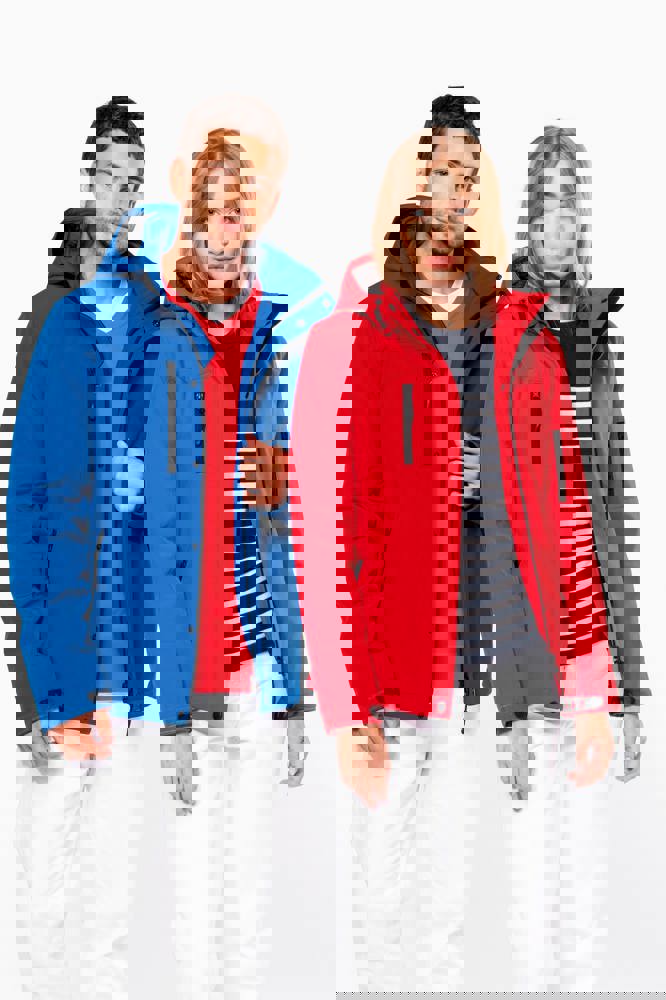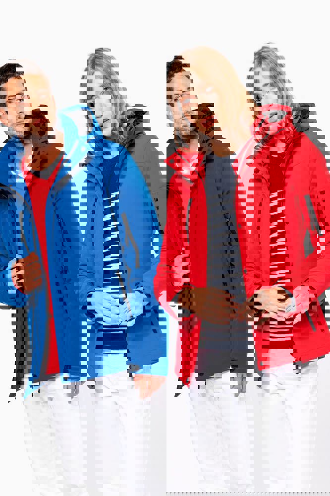95 % Polyester / 5 % Elasthan. Dreilagiges Verbundgewebe atmungsaktiv 3.000 g/m²/24 h und wasserdicht 8.000 mm. Außenmaterial: 95 % Polyester / 5 % Elasthan. Atmungsaktive Mittelmembran. Innenschicht: Mikrofleece. Innenfutter gesteppt, 100 % Polyester. Vorderseite: 4 Reißverschlusstaschen (2 Seitentaschen, 1 am Ärmel, 1 an der rechten Brustseite). 2 Innentaschen mit Druckknopfverschluss. Abnehmbare Kapuze in 3-Bahnen-Design, gefüttert und gesteppt, Kordel mit Stoppern zum Zuziehen. Klettverschluss am Ärmel zur Weitenregulierung. 1 Reißverschluss an der Brusttasche und 1 Reißverschluss am Saum zur Veredelung.