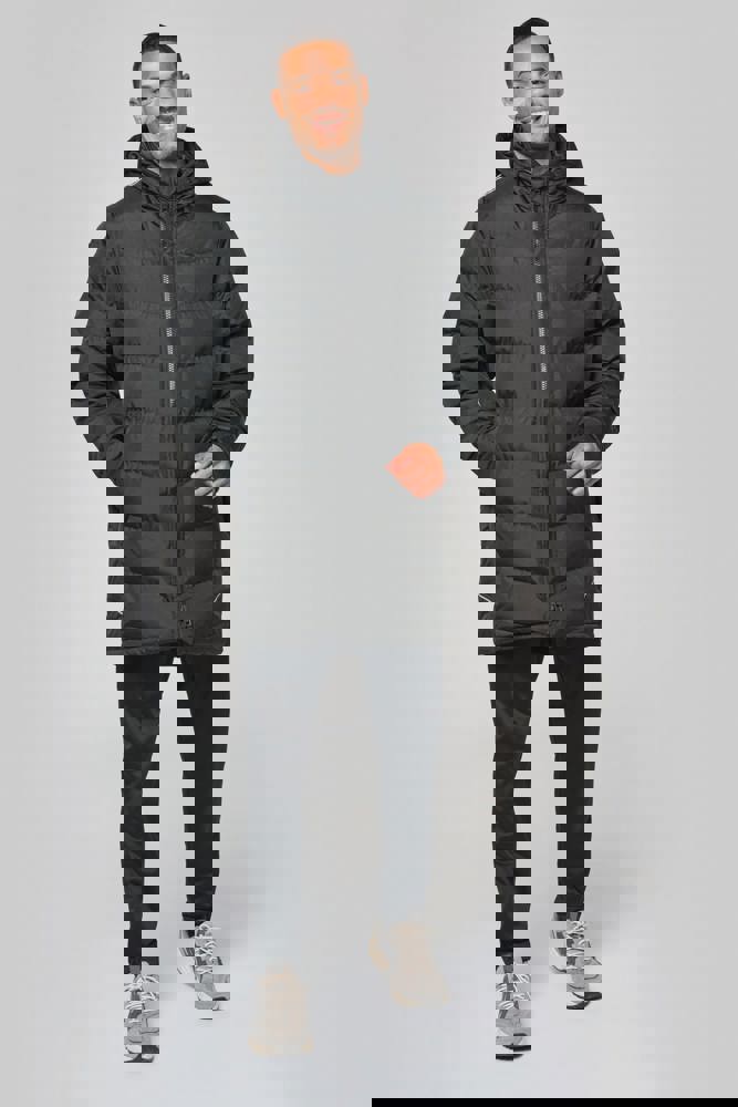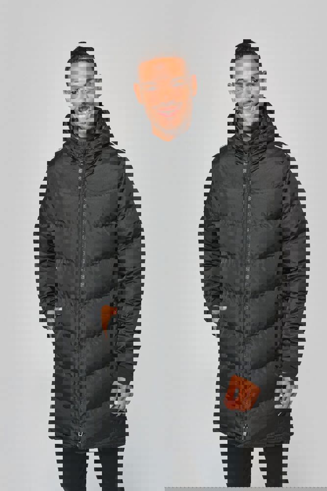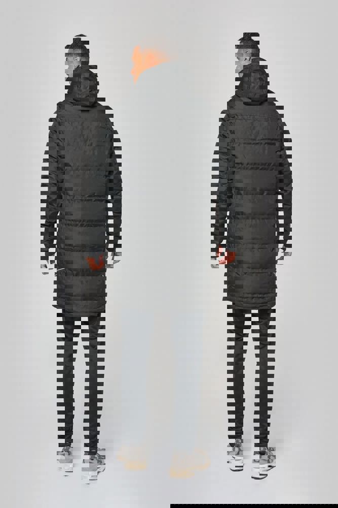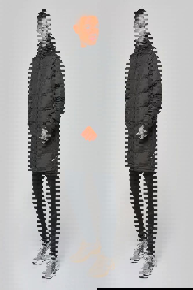 Außenstoff : 100 % Polyester 200 g/m² mit PVC-Beschichtung (wasserabweisender Behandlung). Innenstoff : 100 % Polyester 350 g/m². Futterstoff : 100 % Polyester 60 g/m². 2 Reißverschluss-Seitentaschen. 1 Innentasche. Strickbündchen an Kragen und Ärmelsaum. Reflektierende Querstreifen an Schultern und Seiten. Gefütterte Kapuze. 1 Reißverschluss an der Brusttasche und 1 Reißverschluss am Saum zur Veredelung.