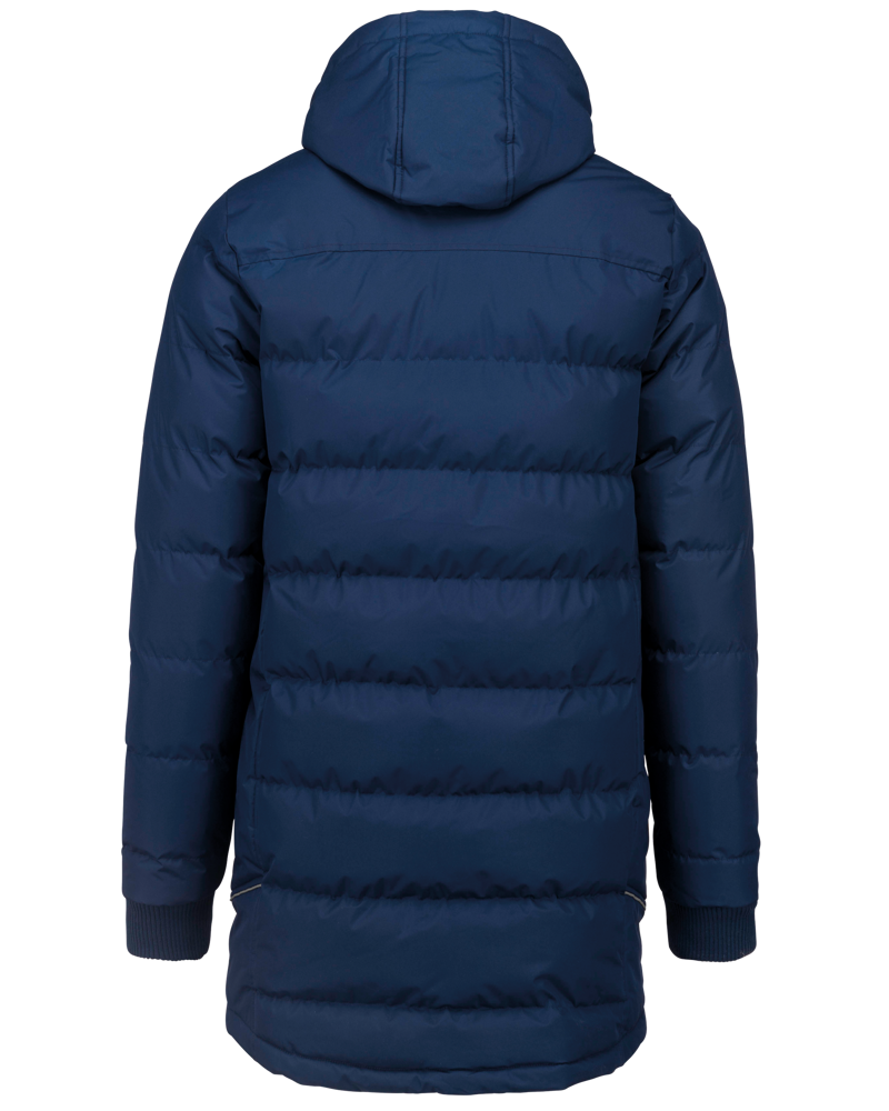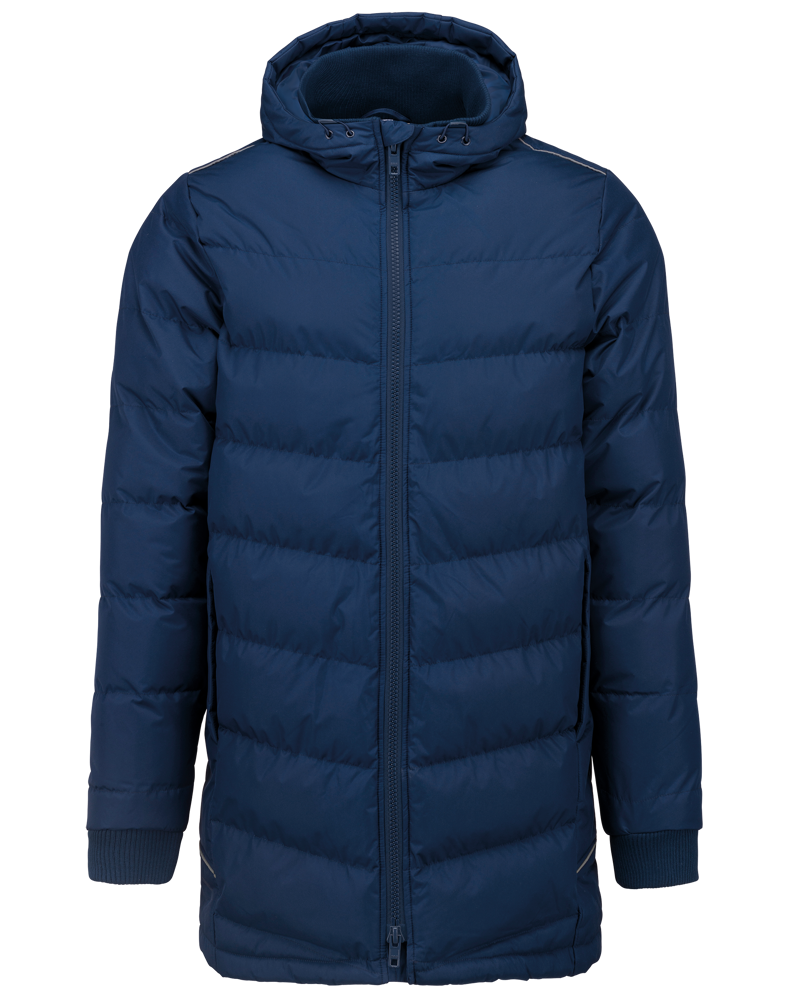 Außenstoff : 100 % Polyester 200 g/m² mit PVC-Beschichtung (wasserabweisender Behandlung). Innenstoff : 100 % Polyester 350 g/m². Futterstoff : 100 % Polyester 60 g/m². 2 Reißverschluss-Seitentaschen. 1 Innentasche. Strickbündchen an Kragen und Ärmelsaum. Reflektierende Querstreifen an Schultern und Seiten. Gefütterte Kapuze. 1 Reißverschluss an der Brusttasche und 1 Reißverschluss am Saum zur Veredelung.