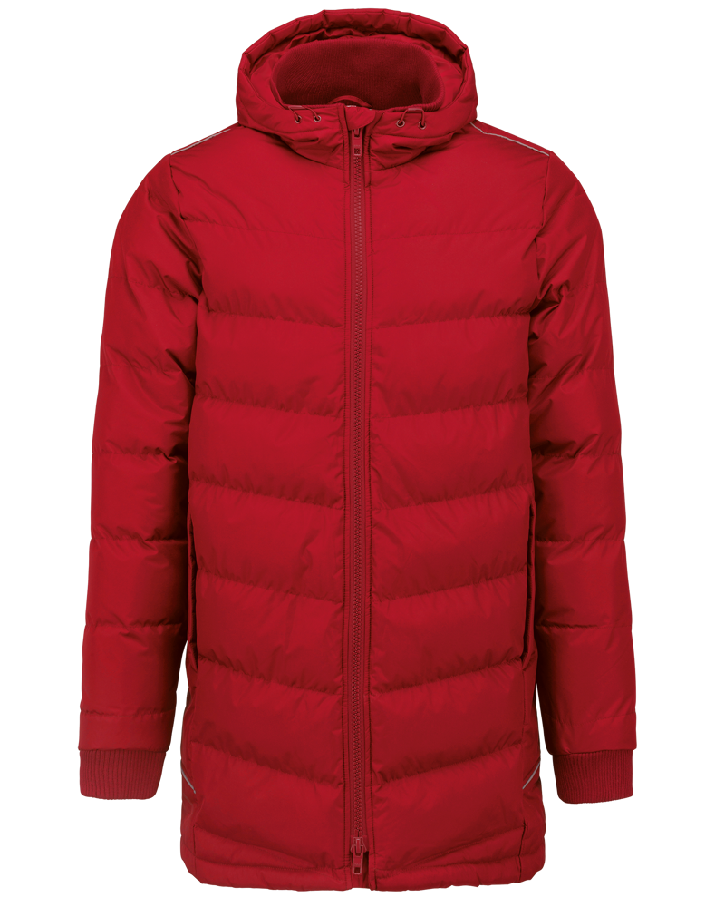 Außenstoff : 100 % Polyester 200 g/m² mit PVC-Beschichtung (wasserabweisender Behandlung). Innenstoff : 100 % Polyester 350 g/m². Futterstoff : 100 % Polyester 60 g/m². 2 Reißverschluss-Seitentaschen. 1 Innentasche. Strickbündchen an Kragen und Ärmelsaum. Reflektierende Querstreifen an Schultern und Seiten. Gefütterte Kapuze. 1 Reißverschluss an der Brusttasche und 1 Reißverschluss am Saum zur Veredelung.