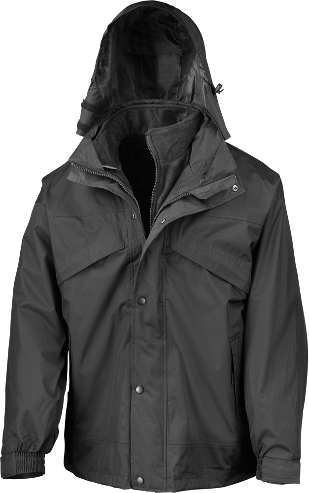Außen: 230 g/m², 100% Polyester (StormDri 4000) mit PVC-Beschichtung. Futter: 100% Polyester. Innenjacke (herausnehmbar): 280 g/m², 100% Polyester (Fleece), in Farbe Black. Außenjacke mit versiegelten Doppelnähten. Wind- und wasserdicht (4.000 mm). Kapuze im Kragen mit Kordelzug und Stoppern. 2-Wege Full Zip und Windschutzblende mit Druckknöpfen. Ventilationsösen unter den Armen. 2 Seiten- und 2 Brusttaschen mit Regenklappe und Zip. Kordelzug im Bund. Zip- und Klick-System zum Befestigen der Innenjacke. Alle Farben werden mit einem kontrastfarbenem Fleece angeboten.