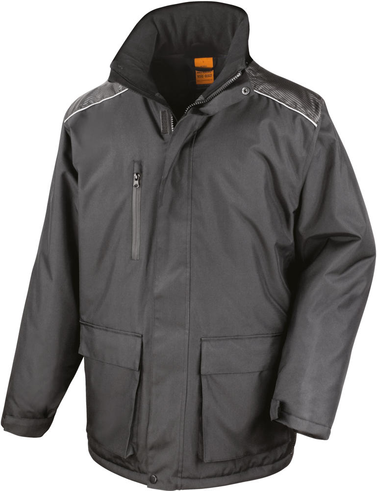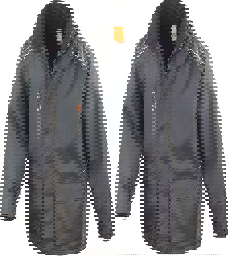 Außen: 100% Polyester 300D, Oxford mit PVC-Beschichtung. Futter (mit Wattierung): 100% Polyester 210T, Taft, Diamant gesteppt. Wind- und wasserdicht (2.000 mm). Versiegelte Nähte. Durch Zip abnehmbare Kapuze, weicher Kragen aus Trikot. 2-Wege-Full Zip mit austauschbaren farbigen Ziehern und Windschutzleiste mit Klettverschluss. Kordelzug im Bund. Durch Klettverschluss verstellbare Ärmelbündchen. Reflektierende Details.