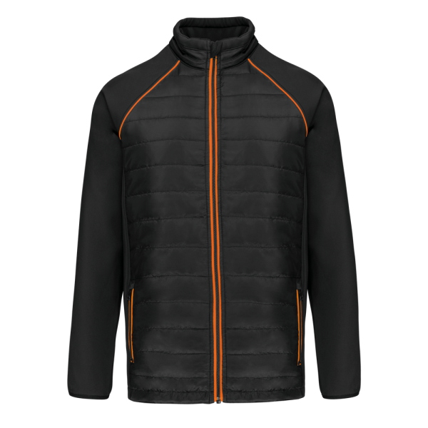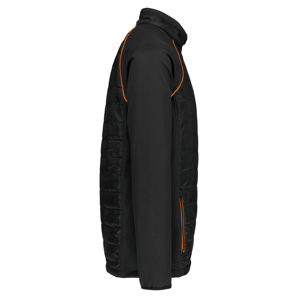 100 % Polyester. Zweilagige Softshell, 4-Wege-Stretch für mehr Tragekomfort mit Fleecefutter an Ärmeln und Schultern für optimale Wärme. Vorderseite und Rücken : 100 % Polyester, 75 g Taft 230T mit Beschichtung. Stoff mit wasserabweisender Behandlung. 2 Reißverschlusstaschen auf der Vorderseite. 1 Namensschild innen links. Kontrastfarbene Paspel an Ärmelbündchen und auf der Krageninnenseite. Reißverschluss auf der Vorderseite und kontrastfarbene Taschen. Unsichtbarer Reißverschluss zur Veredelung am Saum. Ideal für eine tägliche Nutzung.