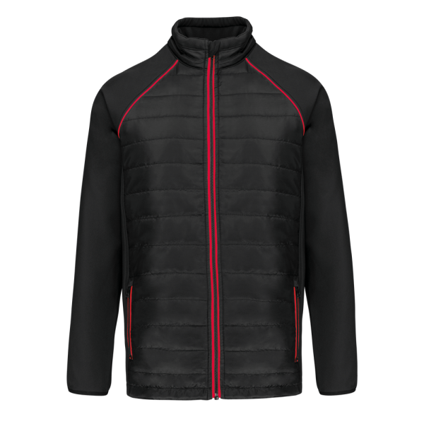 100 % Polyester. Zweilagige Softshell, 4-Wege-Stretch für mehr Tragekomfort mit Fleecefutter an Ärmeln und Schultern für optimale Wärme. Vorderseite und Rücken : 100 % Polyester, 75 g Taft 230T mit Beschichtung. Stoff mit wasserabweisender Behandlung. 2 Reißverschlusstaschen auf der Vorderseite. 1 Namensschild innen links. Kontrastfarbene Paspel an Ärmelbündchen und auf der Krageninnenseite. Reißverschluss auf der Vorderseite und kontrastfarbene Taschen. Unsichtbarer Reißverschluss zur Veredelung am Saum. Ideal für eine tägliche Nutzung.