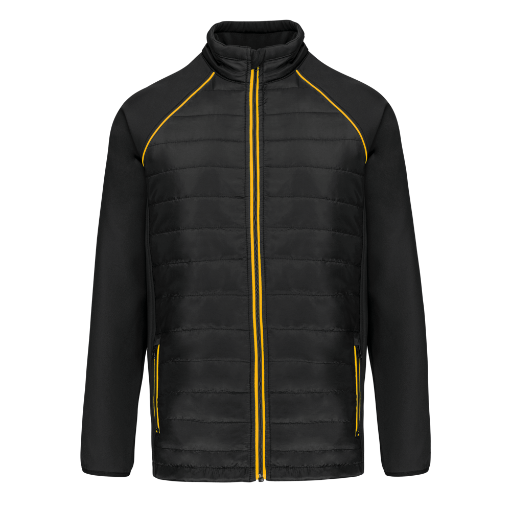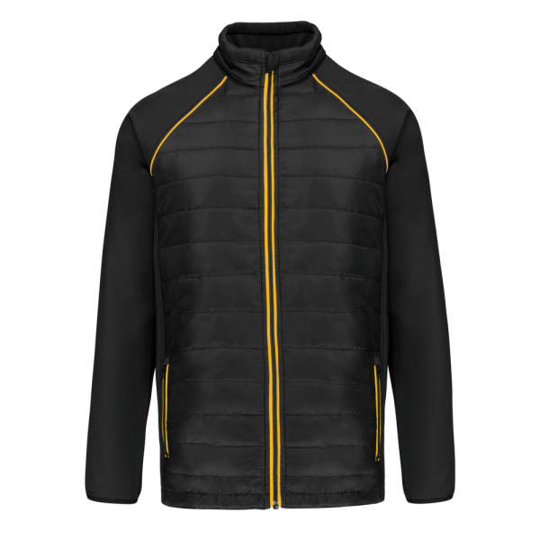 100 % Polyester. Zweilagige Softshell, 4-Wege-Stretch für mehr Tragekomfort mit Fleecefutter an Ärmeln und Schultern für optimale Wärme. Vorderseite und Rücken : 100 % Polyester, 75 g Taft 230T mit Beschichtung. Stoff mit wasserabweisender Behandlung. 2 Reißverschlusstaschen auf der Vorderseite. 1 Namensschild innen links. Kontrastfarbene Paspel an Ärmelbündchen und auf der Krageninnenseite. Reißverschluss auf der Vorderseite und kontrastfarbene Taschen. Unsichtbarer Reißverschluss zur Veredelung am Saum. Ideal für eine tägliche Nutzung.