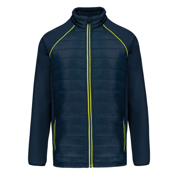 100 % Polyester. Zweilagige Softshell, 4-Wege-Stretch für mehr Tragekomfort mit Fleecefutter an Ärmeln und Schultern für optimale Wärme. Vorderseite und Rücken : 100 % Polyester, 75 g Taft 230T mit Beschichtung. Stoff mit wasserabweisender Behandlung. 2 Reißverschlusstaschen auf der Vorderseite. 1 Namensschild innen links. Kontrastfarbene Paspel an Ärmelbündchen und auf der Krageninnenseite. Reißverschluss auf der Vorderseite und kontrastfarbene Taschen. Unsichtbarer Reißverschluss zur Veredelung am Saum. Ideal für eine tägliche Nutzung.