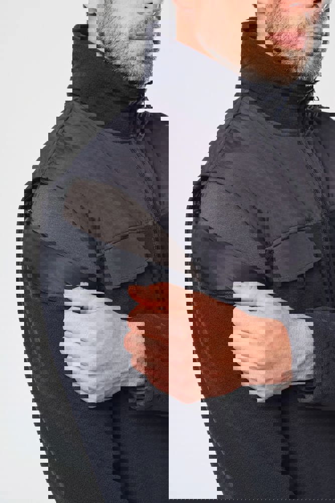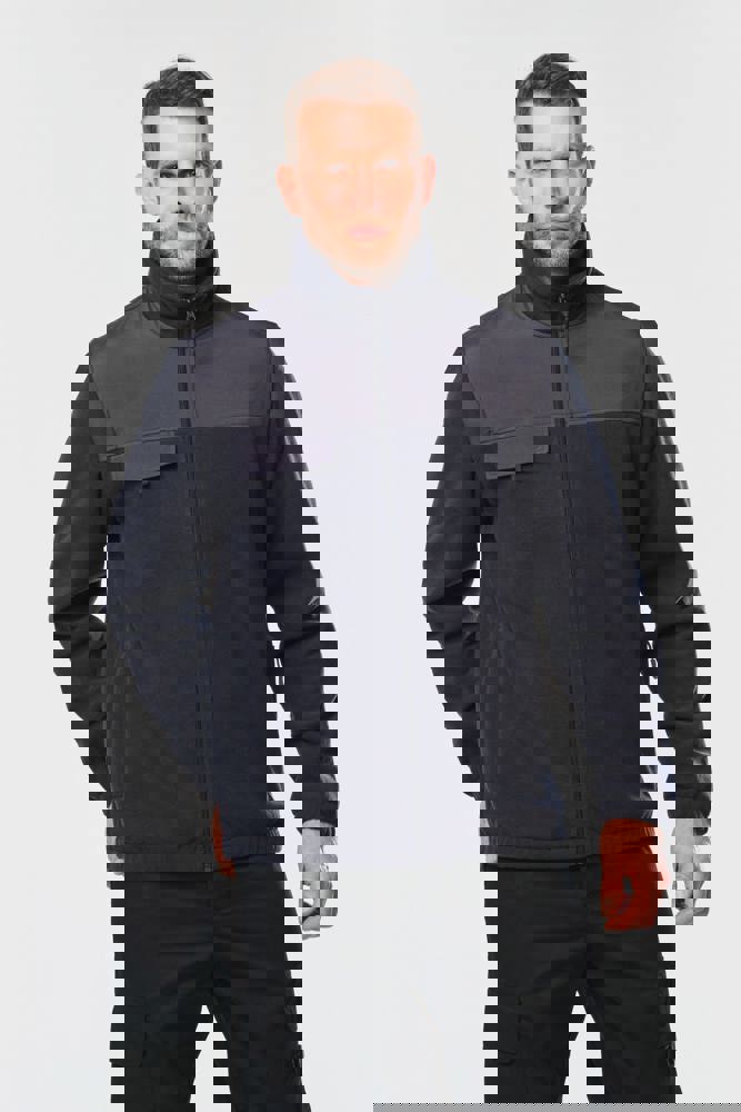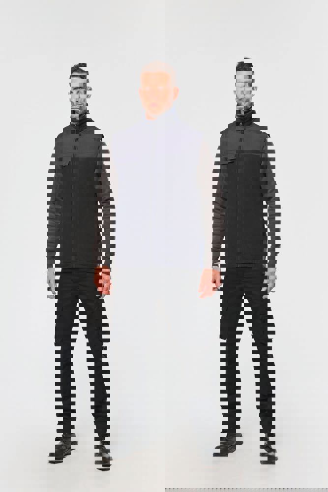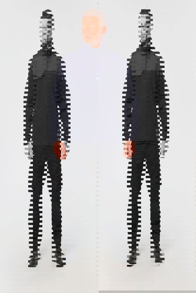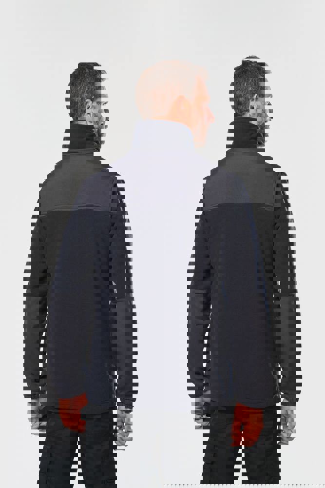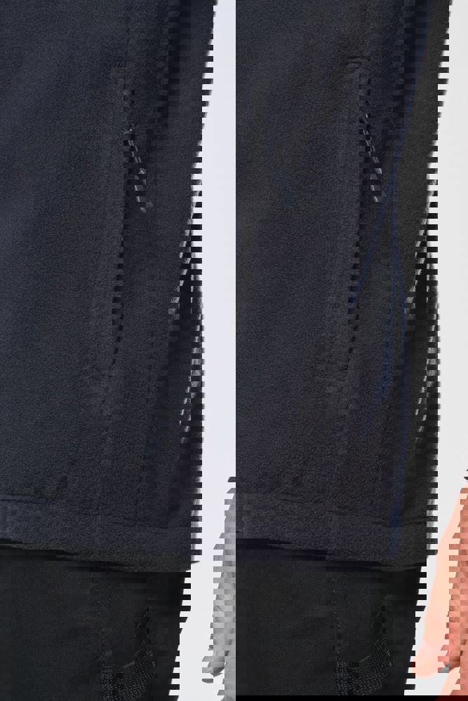100% Polyester. Außenmaterial: 100 % Polyesterfleece 400 g/m². Verstärkungen 100 % Polyester-Taslan mit Acrylbeschichtung. Ärmel mit 210T Polyester-Innenfutter. 2-in-1-Fleecejacke. 2 Reißverschluss-Vordertaschen und 1 Reißverschluss-Brusttasche mit Klappe und Klettverschluss. Besätze Ton-in-Ton vorn, hinten und an den Unterarmen. Front und Rücken leicht veredelbar. Polyester gefütterte, abnehmbare Ärmel für mehr Komfort. Ärmelbündchen und Bund elastisch.