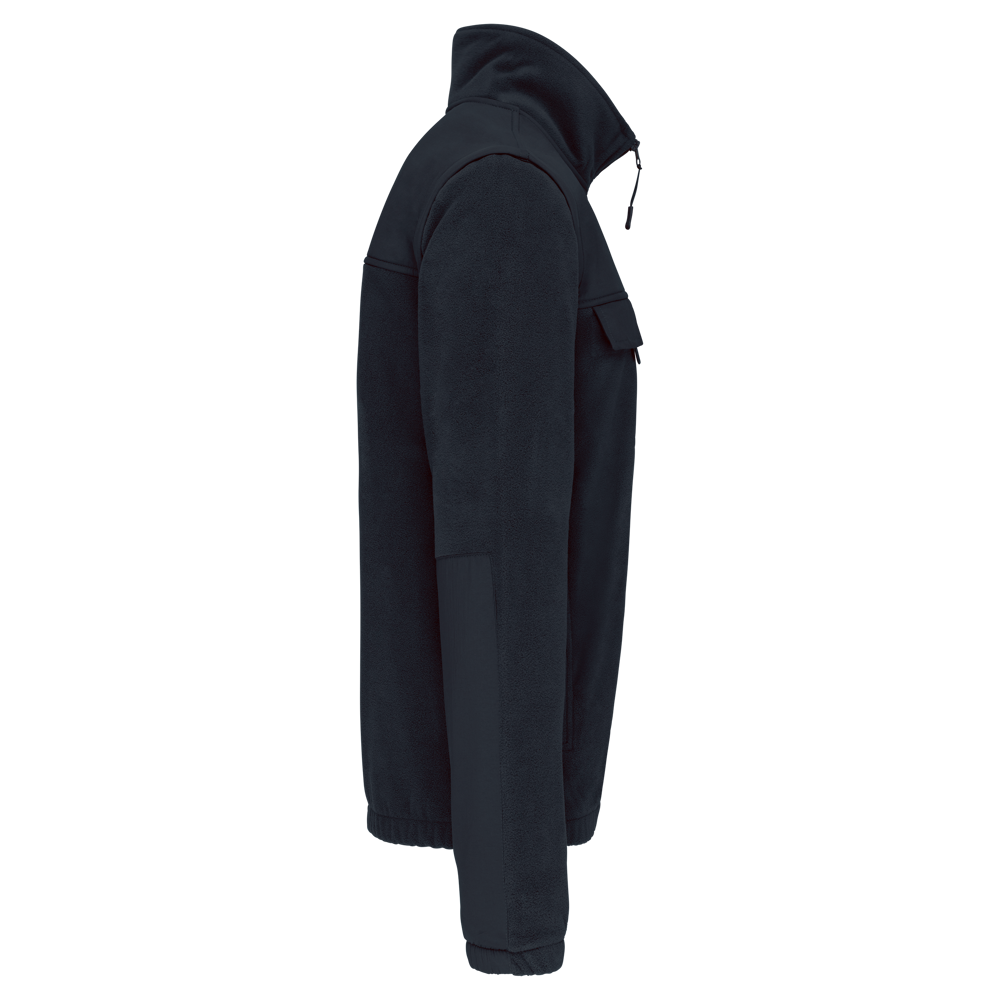 100% Polyester. Außenmaterial: 100 % Polyesterfleece 400 g/m². Verstärkungen 100 % Polyester-Taslan mit Acrylbeschichtung. Ärmel mit 210T Polyester-Innenfutter. 2-in-1-Fleecejacke. 2 Reißverschluss-Vordertaschen und 1 Reißverschluss-Brusttasche mit Klappe und Klettverschluss. Besätze Ton-in-Ton vorn, hinten und an den Unterarmen. Front und Rücken leicht veredelbar. Polyester gefütterte, abnehmbare Ärmel für mehr Komfort. Ärmelbündchen und Bund elastisch.