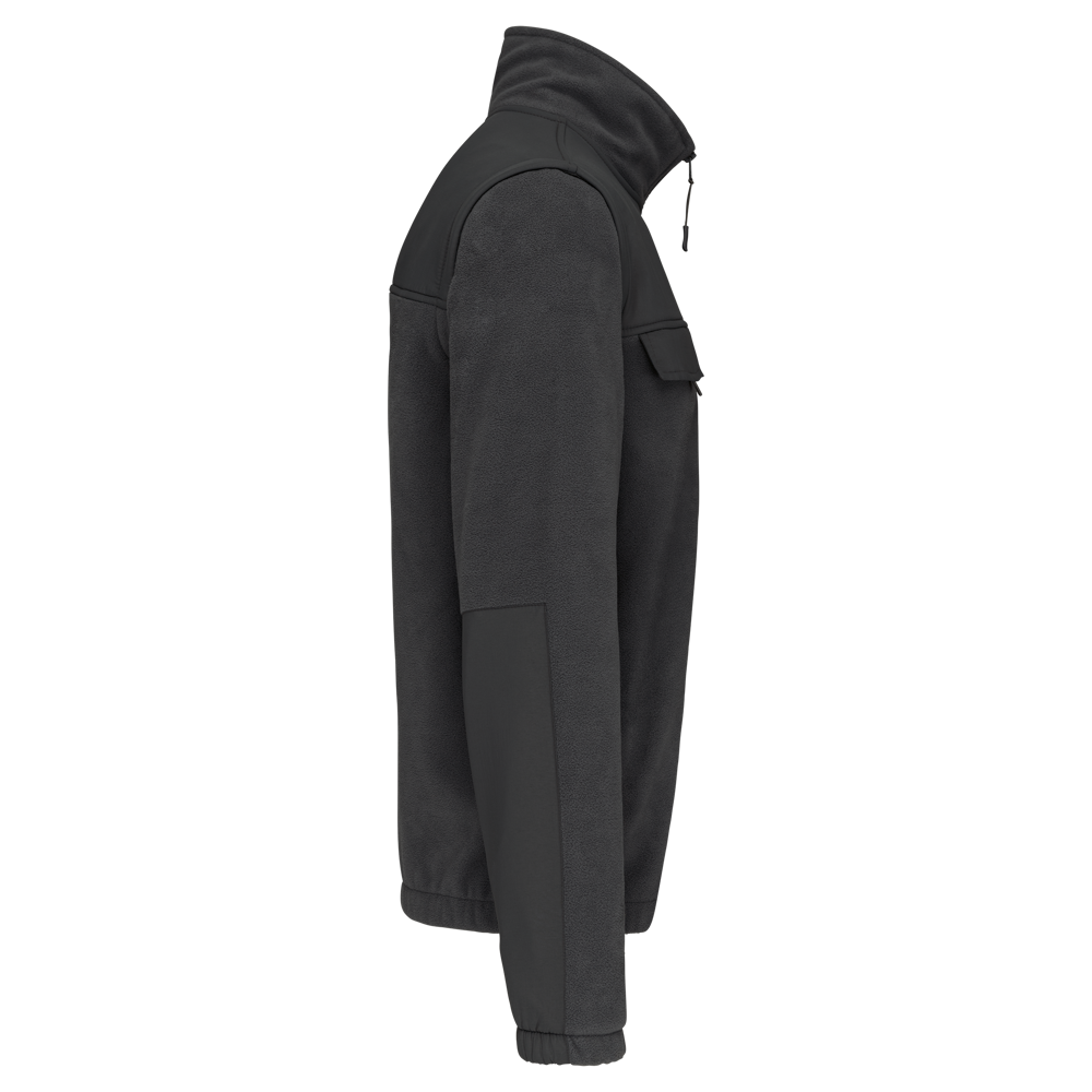 100% Polyester. Außenmaterial: 100 % Polyesterfleece 400 g/m². Verstärkungen 100 % Polyester-Taslan mit Acrylbeschichtung. Ärmel mit 210T Polyester-Innenfutter. 2-in-1-Fleecejacke. 2 Reißverschluss-Vordertaschen und 1 Reißverschluss-Brusttasche mit Klappe und Klettverschluss. Besätze Ton-in-Ton vorn, hinten und an den Unterarmen. Front und Rücken leicht veredelbar. Polyester gefütterte, abnehmbare Ärmel für mehr Komfort. Ärmelbündchen und Bund elastisch.