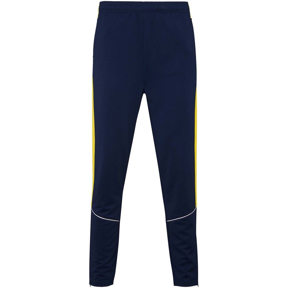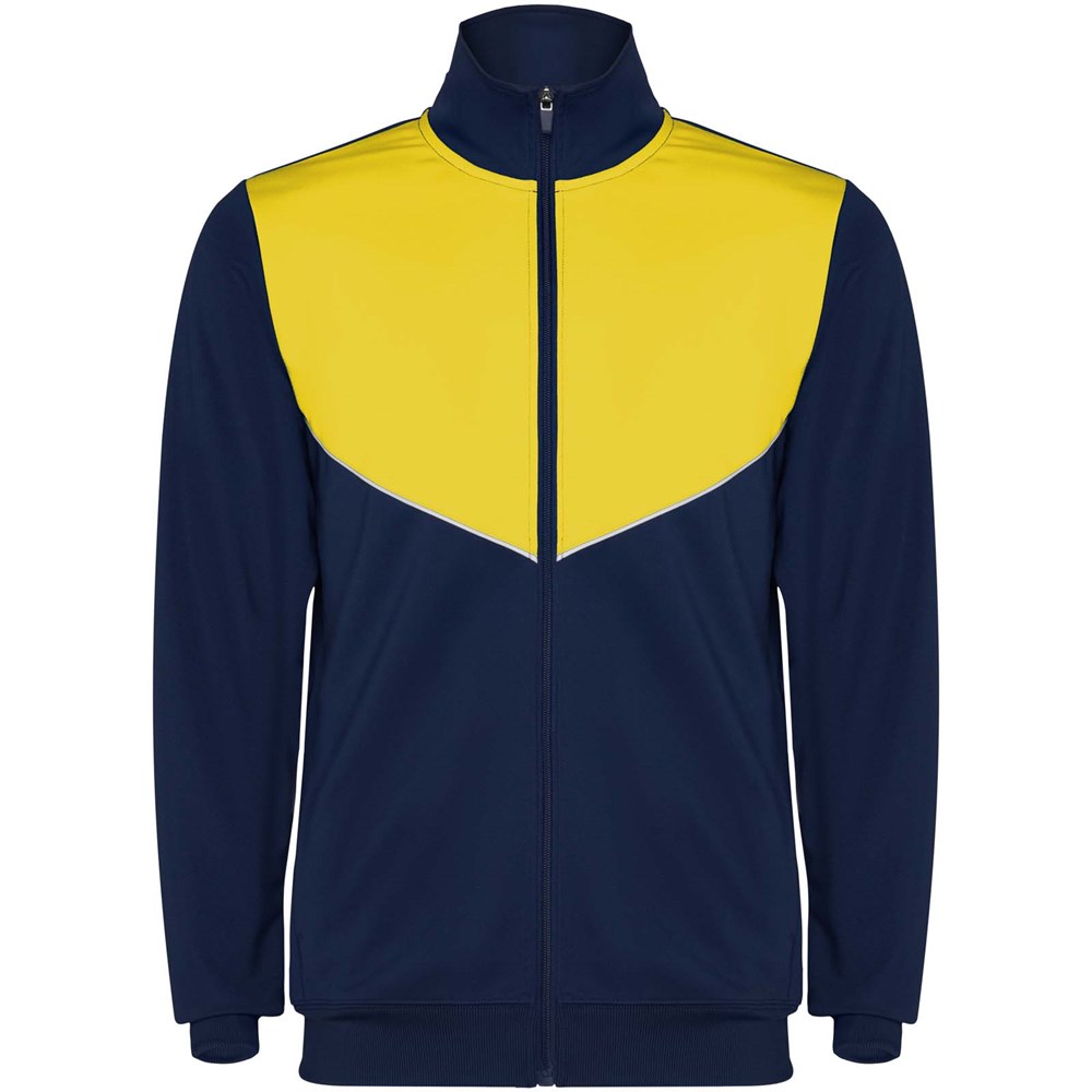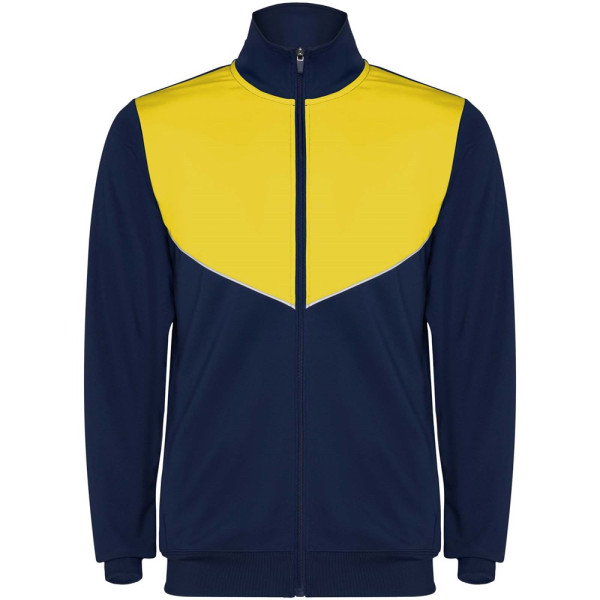 Trainingsanzug aus leichtem und elastischem Stoff. Jacke mit farblich abgesetzten Nähten im Brustbereich. Hoher Kragen mit Kontrastnähten. Zentraler Frontreißverschluss. Seitentaschen. 2x2-Rippenbündchen an Ärmeln und Bund. Hose mit elastischem Bund und Kordelzug. Seitliche Kontrasteinsätze mit Steppnaht. Beinsaum mit Reißverschluss.