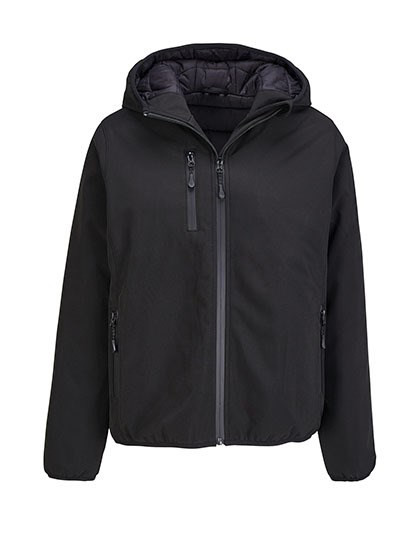 Aus recyceltem Polyester | Dreilagiges Softshell-Gewebe | Wasserdichte und atmungsaktive 5000-mm-Membran | Vollständig wattierte Softshelljacke für den Winter | Kapuze mit elastischem Abschluss | Vorderverschluss, Seiten- und Brusttaschen mit schwarzem, wasserdichtem Nylon-Reißverschluss | Drei Innentaschen | Reißverschluss zur individuellen Anpassung | Elastische Ton-in-Ton-Schrägbandeinfassung an Bündchen und Saum