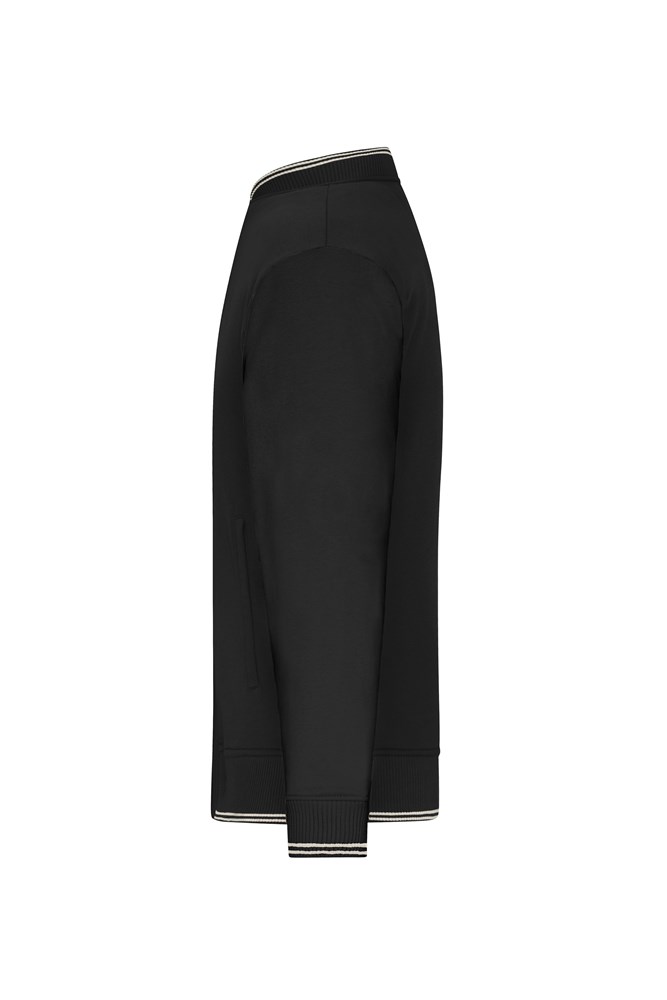 Hochwertige Sweat-Qualität mit angerauter Innenseite Materialmix aus gekämmter, ringgesponnener BIO-Baumwolle und recyceltem Polyester Kragen und Bündchen mit Kontraststreifen Kragen, Armbündchen und Bund mit Elasthan 2 seitliche Eingrifftaschen Frontverschluss mit Druckknöpfen 1/2 Oberweite: 53 cm 1/2 Saumweite: 42 cm Länge ab Schulter: 64 cm Ärmel Länge: 59 cm OEKO-TEX® Standard 100 (25.HDE.51239) Bio Baumwolle OCS Standard blended RCS blended