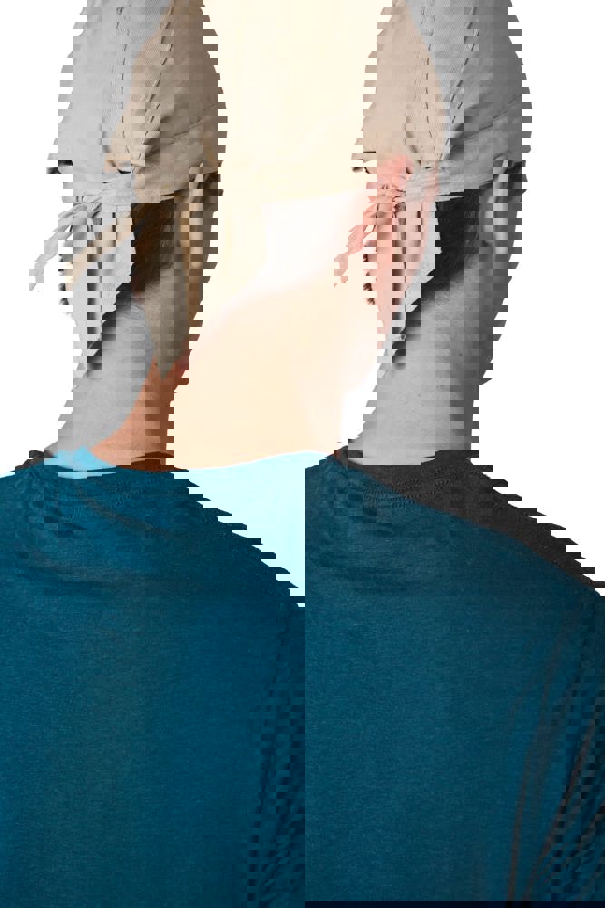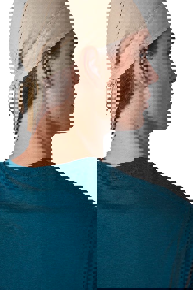100% gebürstetes Baumwolltwill. Das Tuch wird mit 2 Bändern am Hinterkopf zusammengebunden. mehr