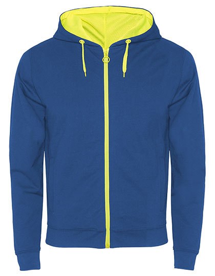 Slub Garn | Unisex Sweat-Jacke mit fluoreszierenden Teilen | Durchgehender Reißverschluss mit fluoreszierenden Puller | Kapuzeninnenseite aus Meshgewebe, Kordelzug und Metall-Ösen in fluoreszierender Farbe | 1x1 Ripp-Strick am Ärmelbündchen und Saum | Zwei Fronttaschen | Verstärktes Nackenband | Herausreißbares Label | Innenseite nicht angeraut