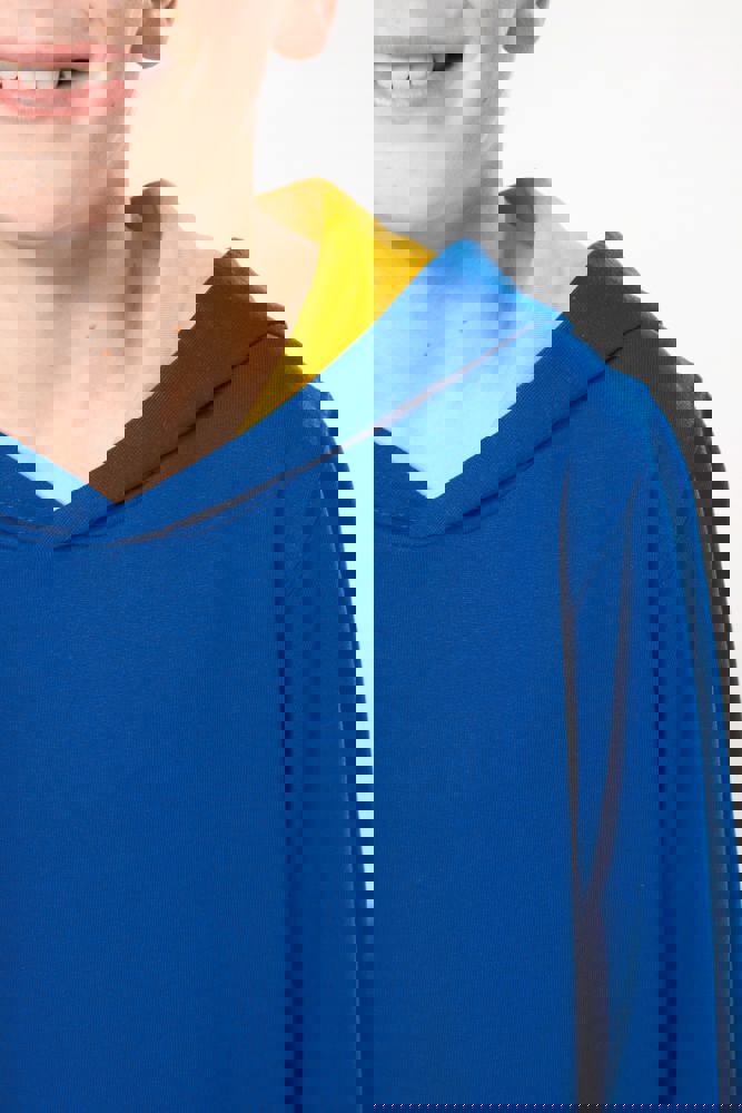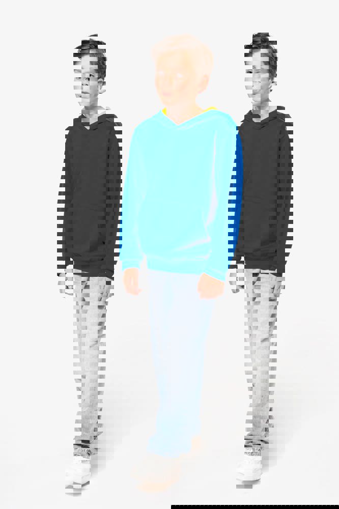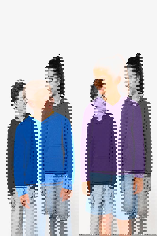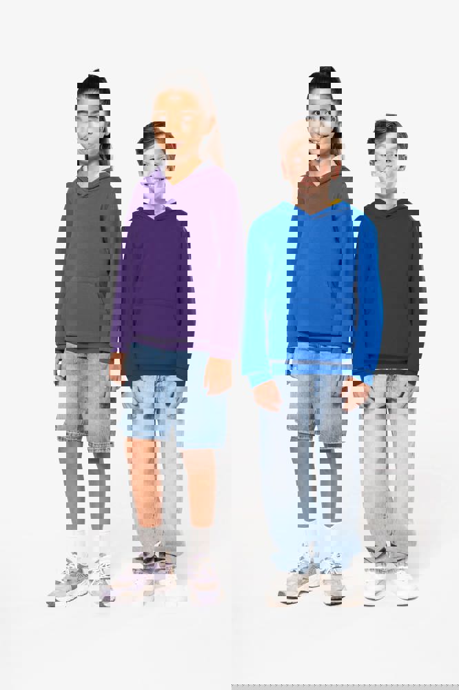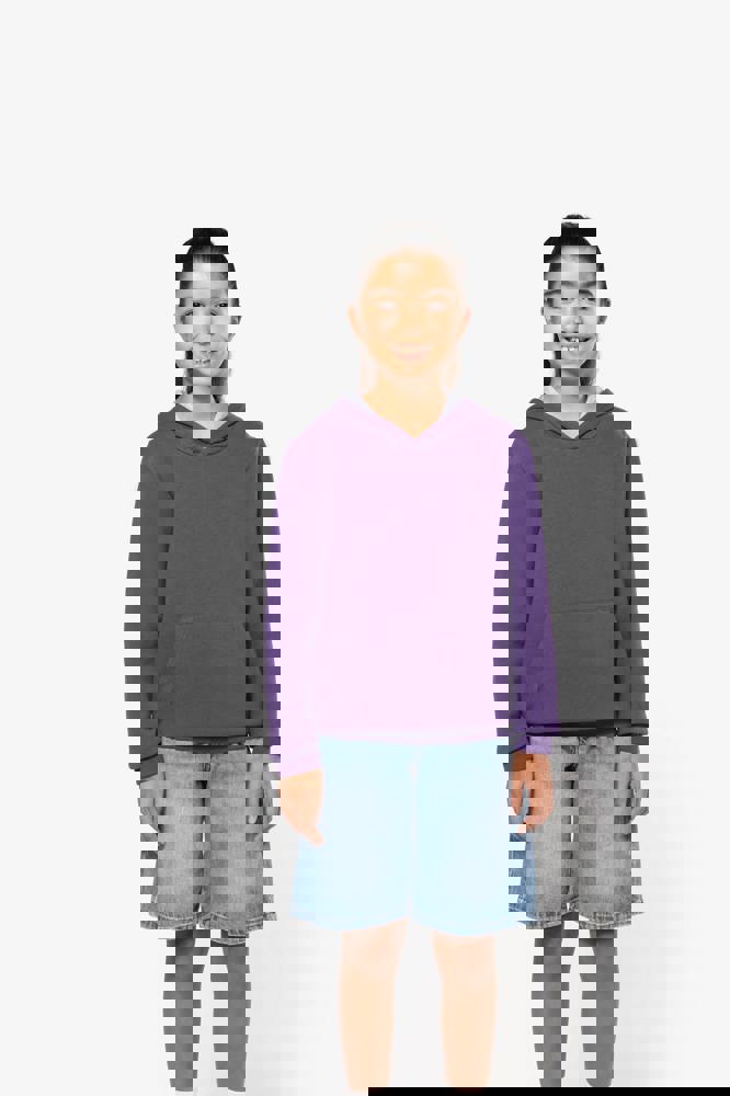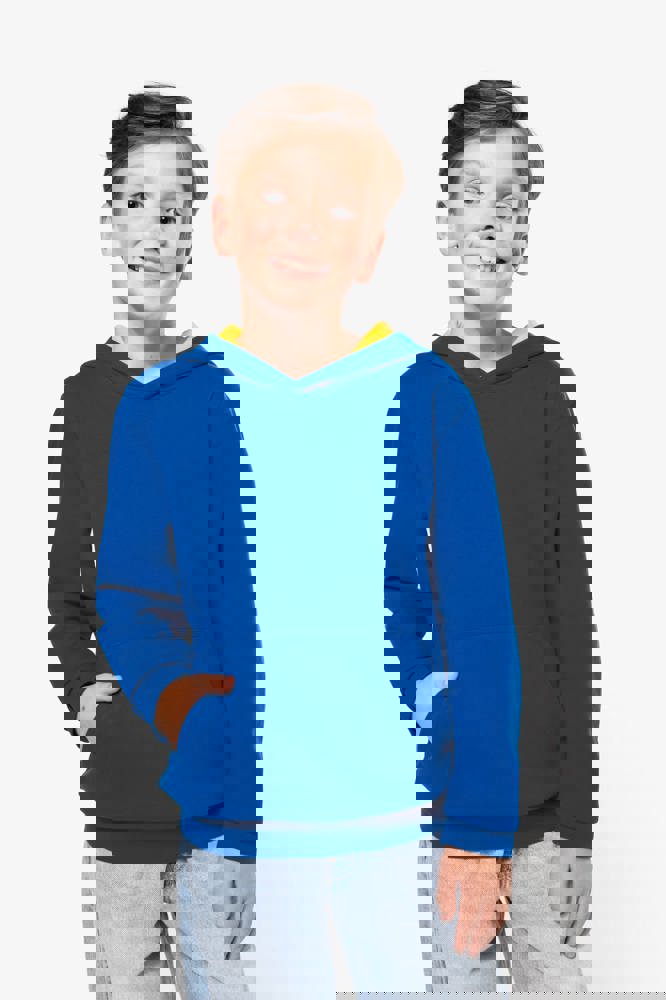 80% Baumwolle / 20% Polyester. Gekämmte Baumwolle. Gebürstetes Fleece. Kängurutasche und Kragen mit Kopfhörerkabel-Durchzug. Ärmel und Bund gerippt. Gefütterte Kapuze inwendig in Kontrastfarbe.