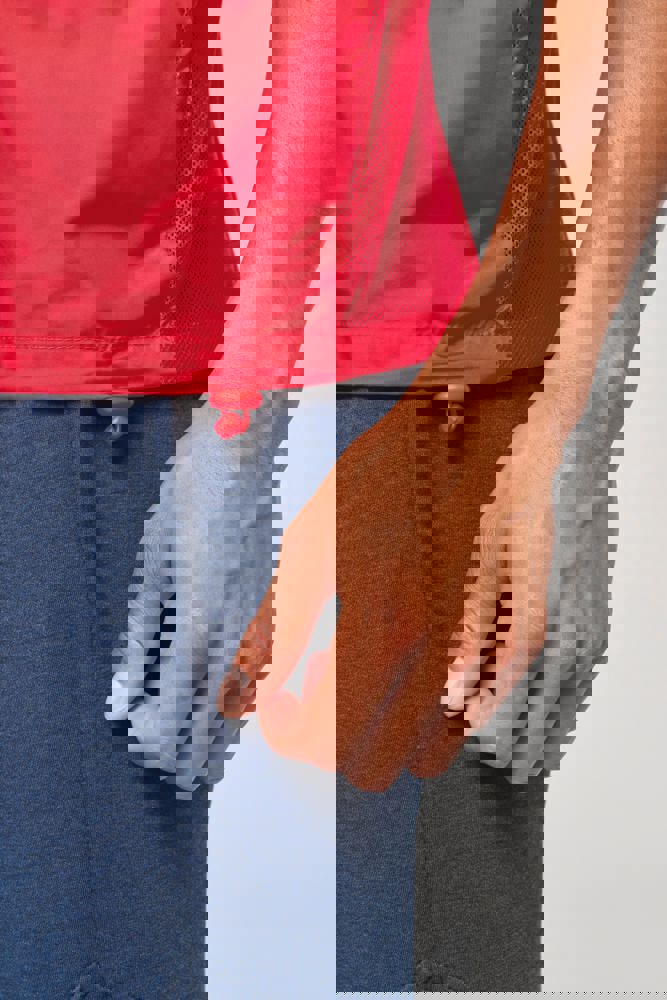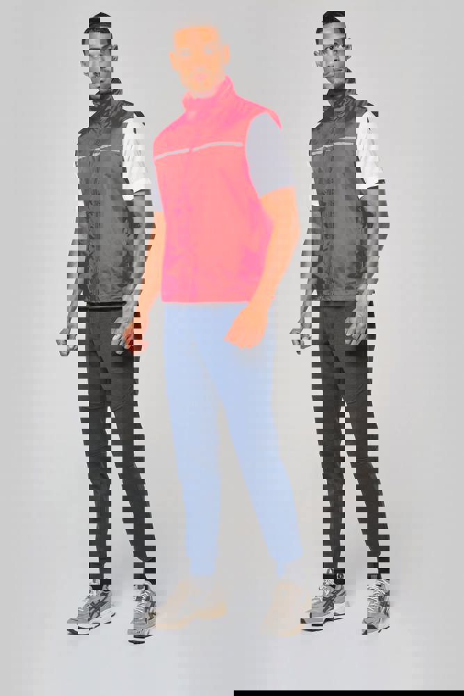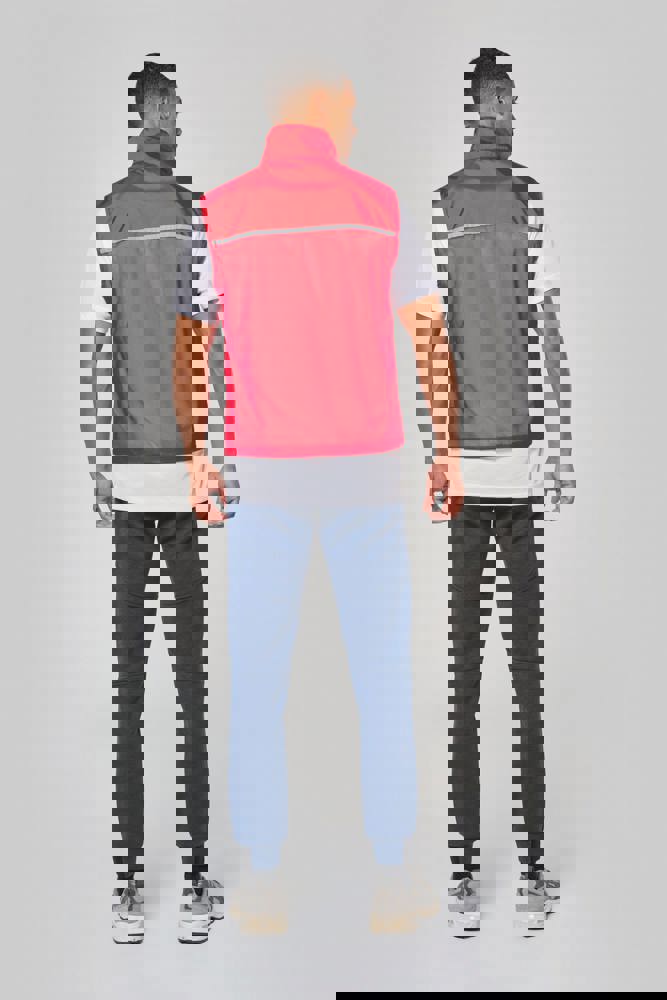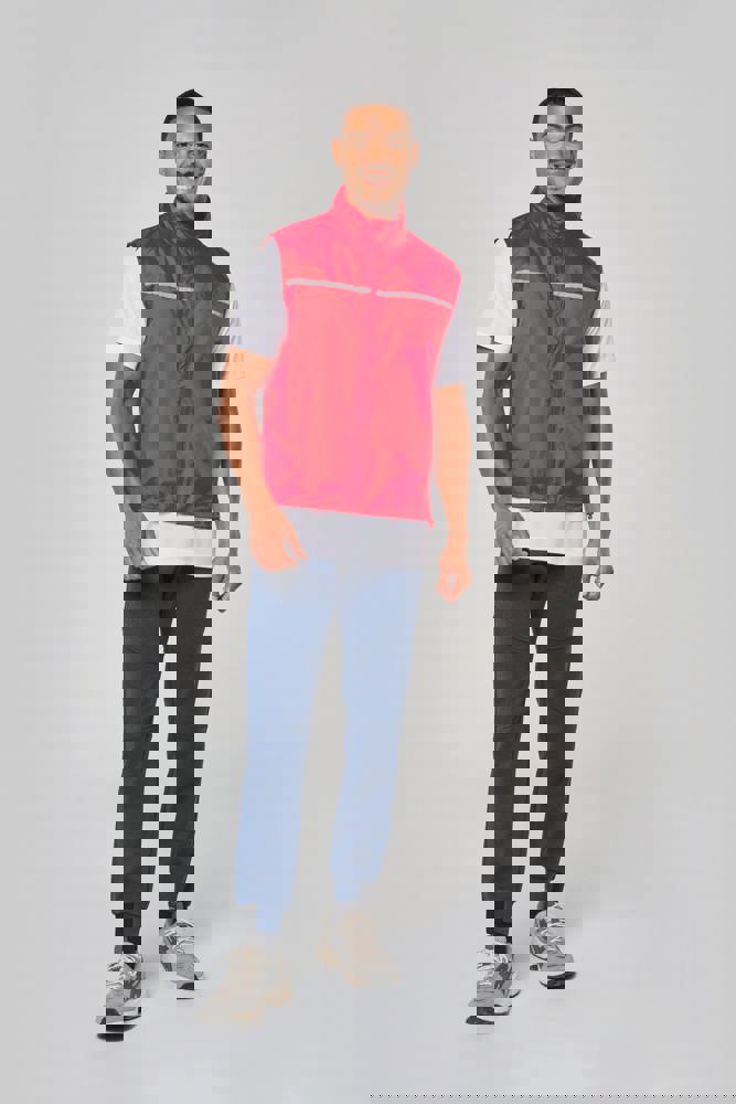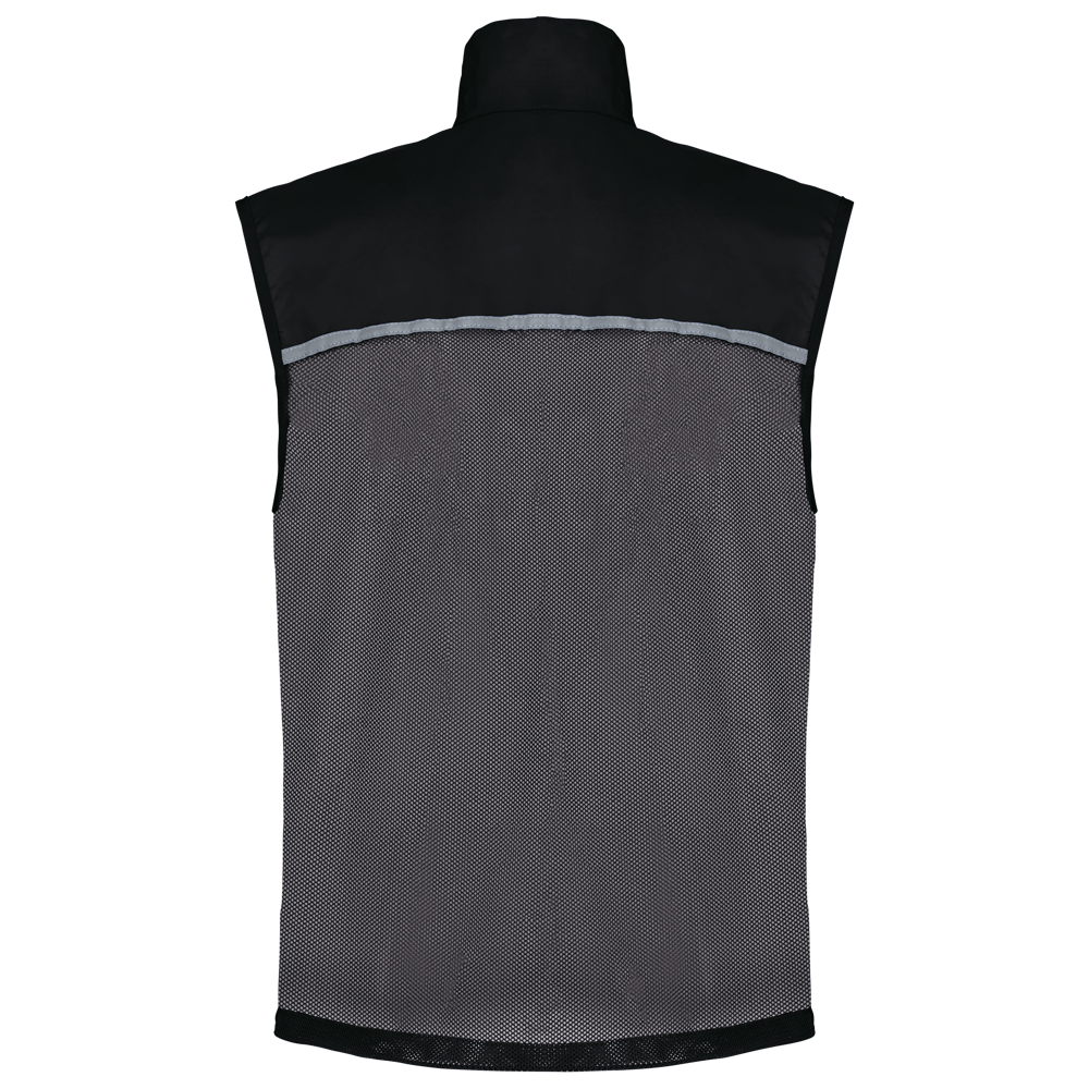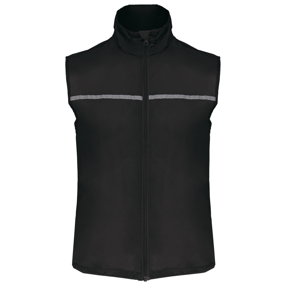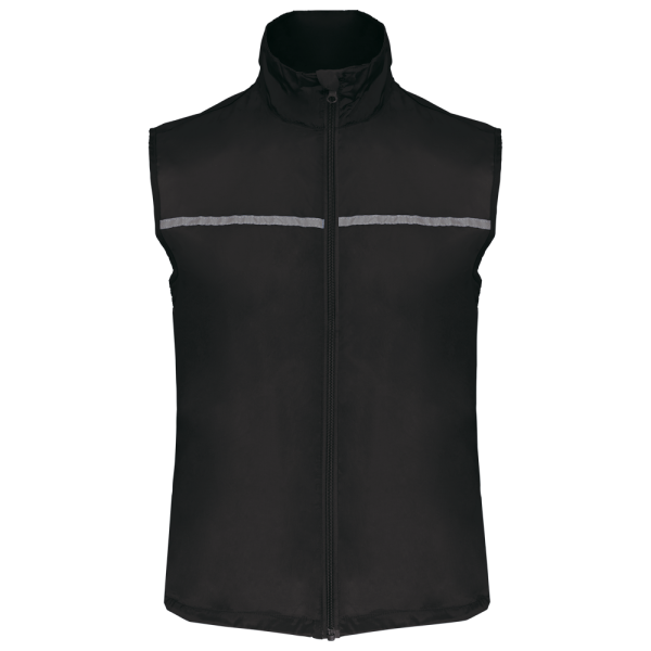 Winddicht aus 100% Polyamid. Rückenteil aus Netzstoff. Elastischer Kordelzug mit Stoppern am Bund. Reflektorstreifen vorne und hinten. Mehrzweck-Innentasche. Abmessung 9,5x11 cm.