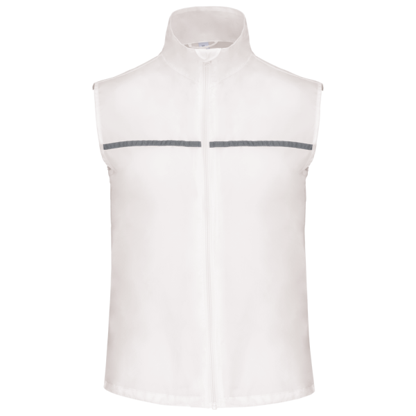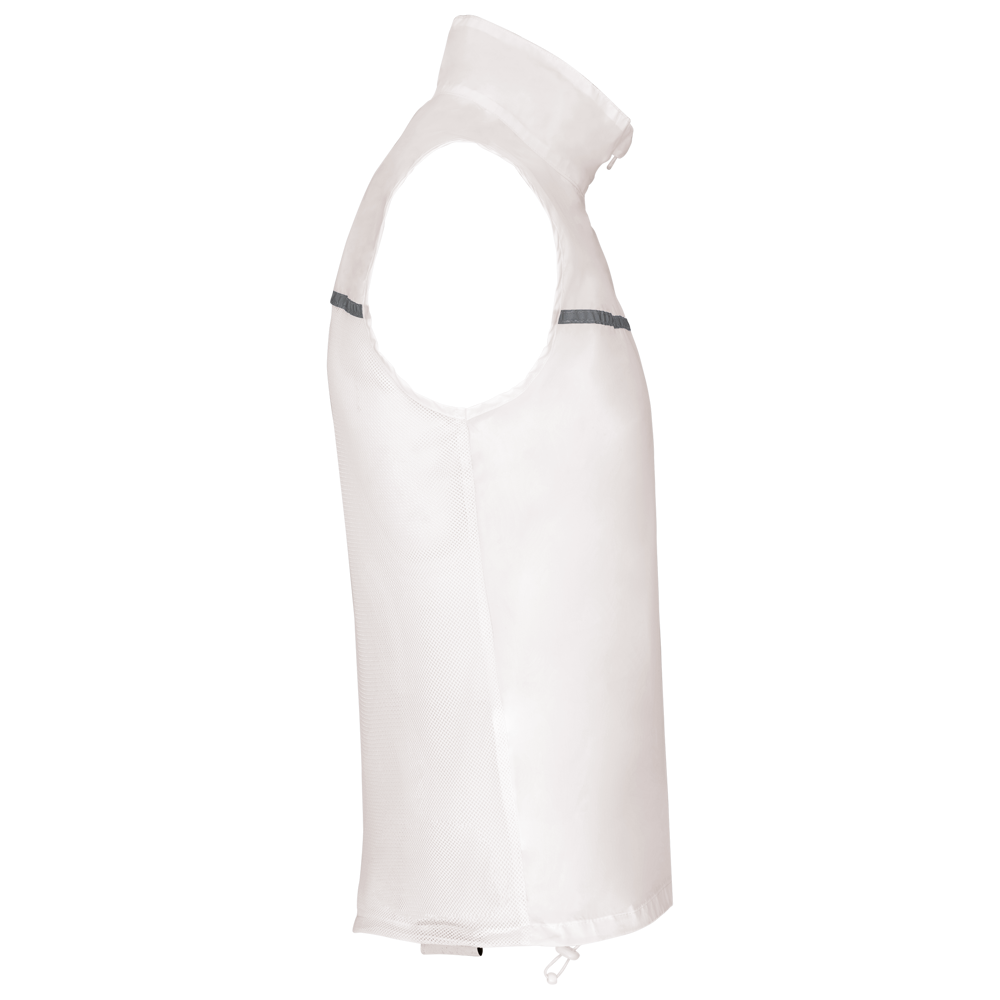 Winddicht aus 100% Polyamid. Rückenteil aus Netzstoff. Elastischer Kordelzug mit Stoppern am Bund. Reflektorstreifen vorne und hinten. Mehrzweck-Innentasche. Abmessung 9,5x11 cm.