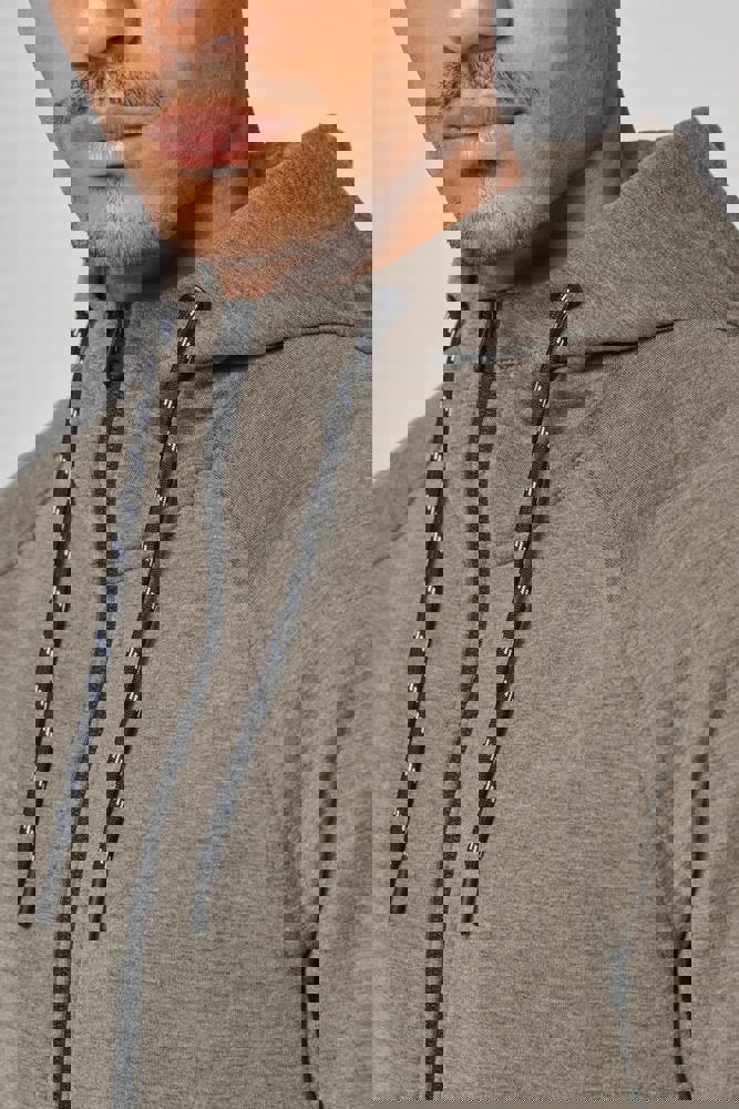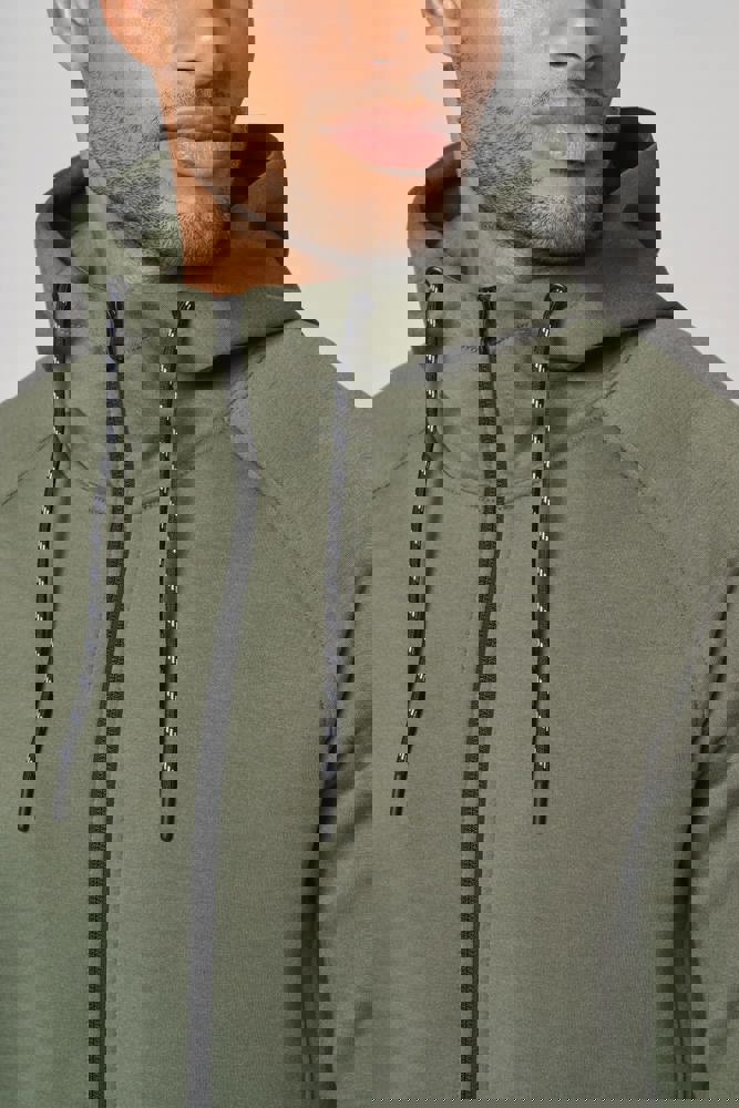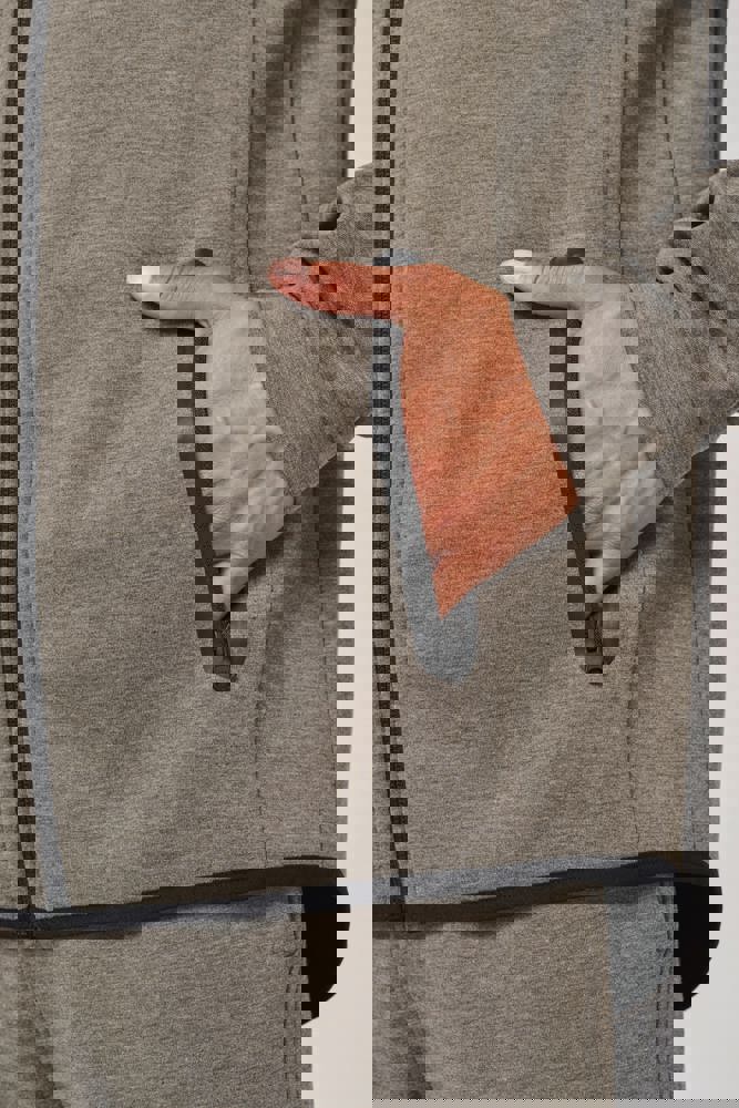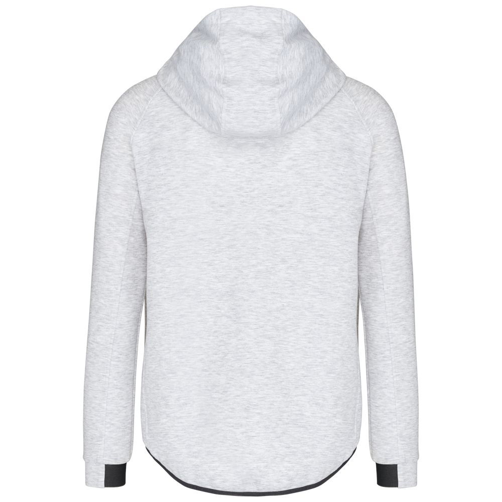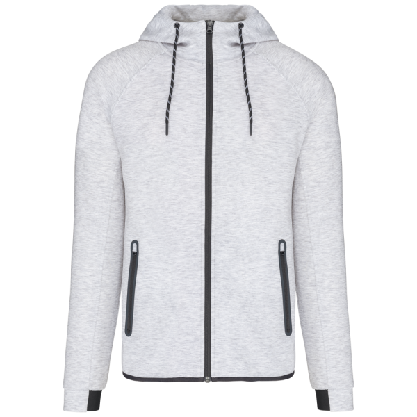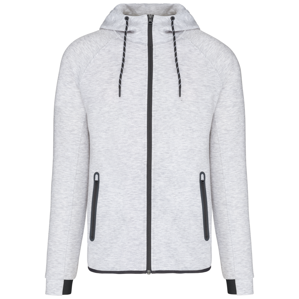 94% Polyester/ 6% Elasthan (Melierte Farben : 79 % Polyester/ 15 % Viskose/ 6 % Elasthan). Besonders bequemes Material. Reißverschluss. 2 geschweißte Reißverschlusstaschen vorne. Kapuze mit Jerseyfutter aus 65% Polyester/ 35% Viskose mit zweifarbigem Kordelzug mit Kunststoffkappen an den Enden. Schmale Ärmelbündchen mit kontrastfarbenem Elastikeinsatz. Kontrastfarbenes Schrägband am Saum. Black auf allen Farben und Dark Grey auf der Ash Heather (auch Verschlüsse).