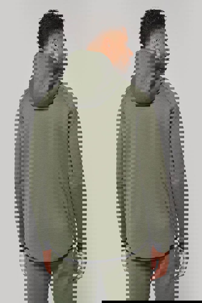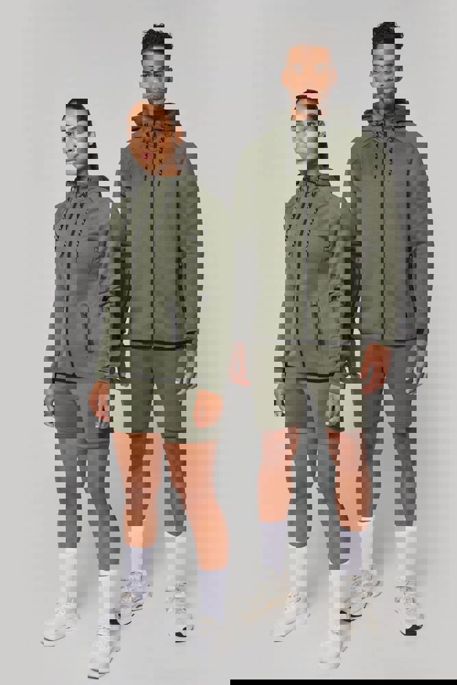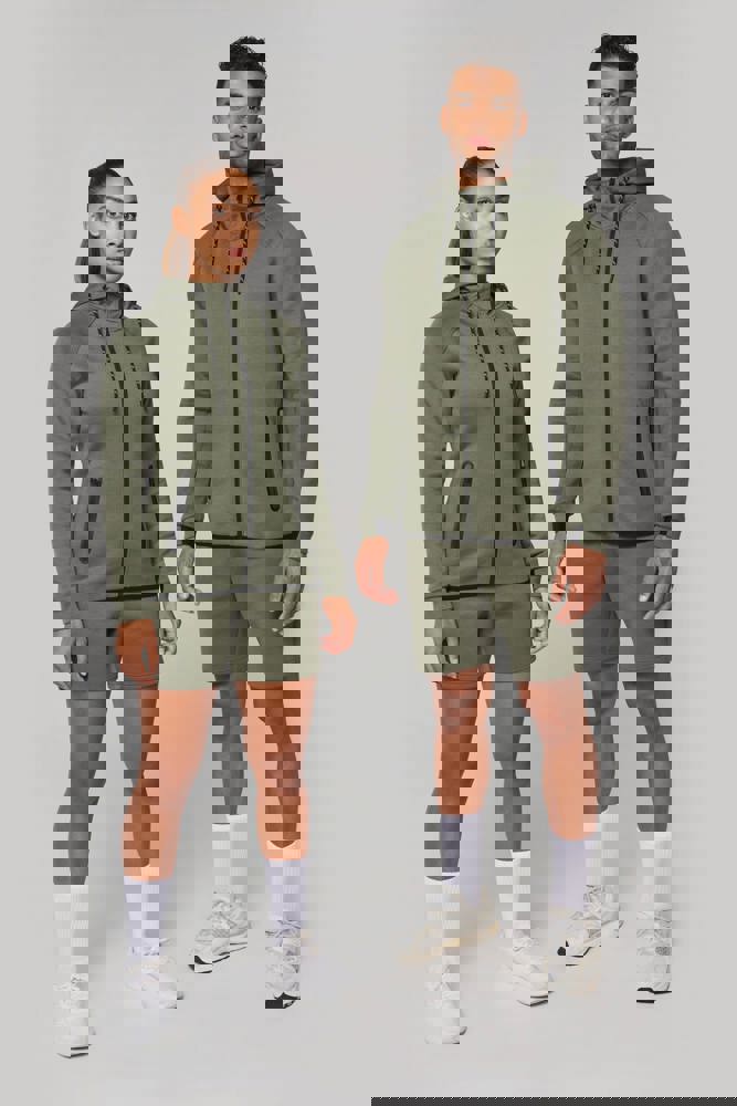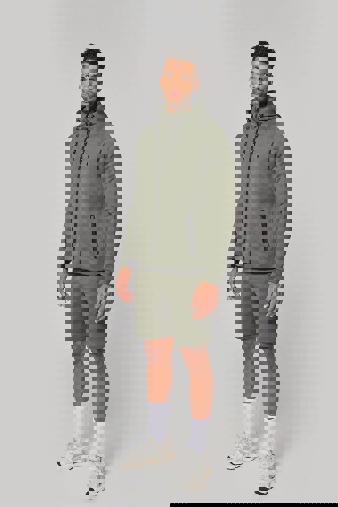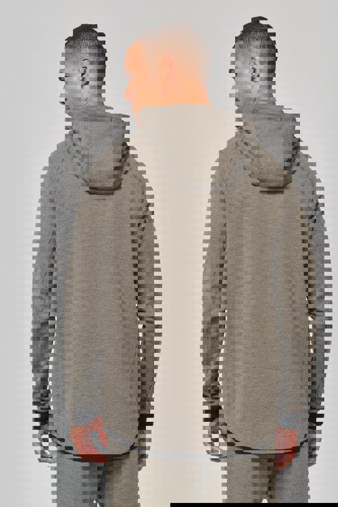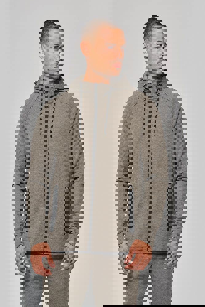 94% Polyester/ 6% Elasthan (Melierte Farben : 79 % Polyester/ 15 % Viskose/ 6 % Elasthan). Besonders bequemes Material. Reißverschluss. 2 geschweißte Reißverschlusstaschen vorne. Kapuze mit Jerseyfutter aus 65% Polyester/ 35% Viskose mit zweifarbigem Kordelzug mit Kunststoffkappen an den Enden. Schmale Ärmelbündchen mit kontrastfarbenem Elastikeinsatz. Kontrastfarbenes Schrägband am Saum. Black auf allen Farben und Dark Grey auf der Ash Heather (auch Verschlüsse).