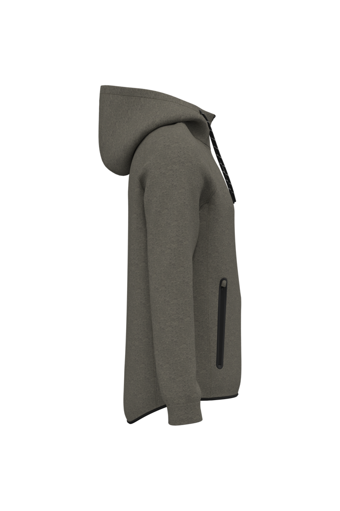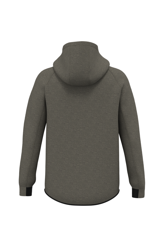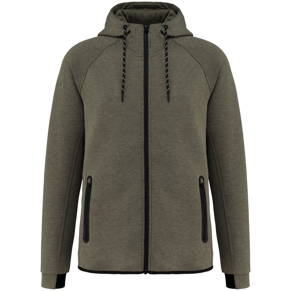 94% Polyester/ 6% Elasthan (Melierte Farben : 79 % Polyester/ 15 % Viskose/ 6 % Elasthan). Besonders bequemes Material. Reißverschluss. 2 geschweißte Reißverschlusstaschen vorne. Kapuze mit Jerseyfutter aus 65% Polyester/ 35% Viskose mit zweifarbigem Kordelzug mit Kunststoffkappen an den Enden. Schmale Ärmelbündchen mit kontrastfarbenem Elastikeinsatz. Kontrastfarbenes Schrägband am Saum. Black auf allen Farben und Dark Grey auf der Ash Heather (auch Verschlüsse).