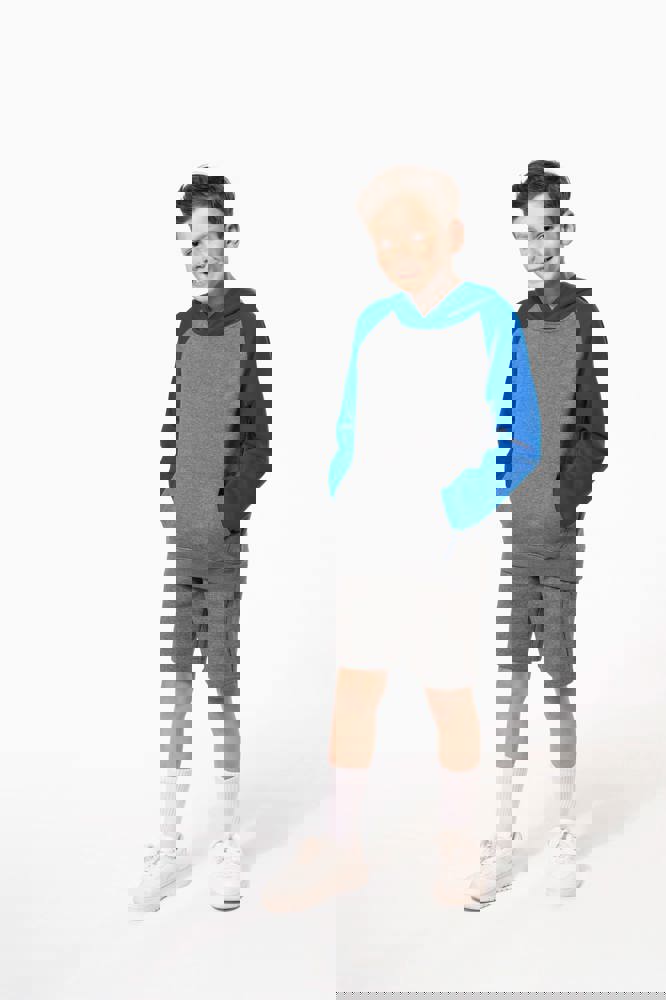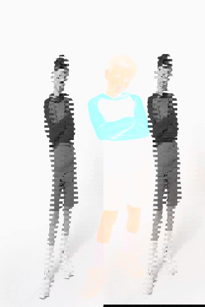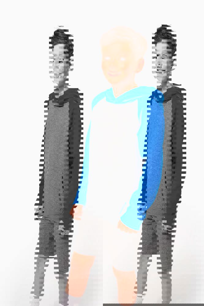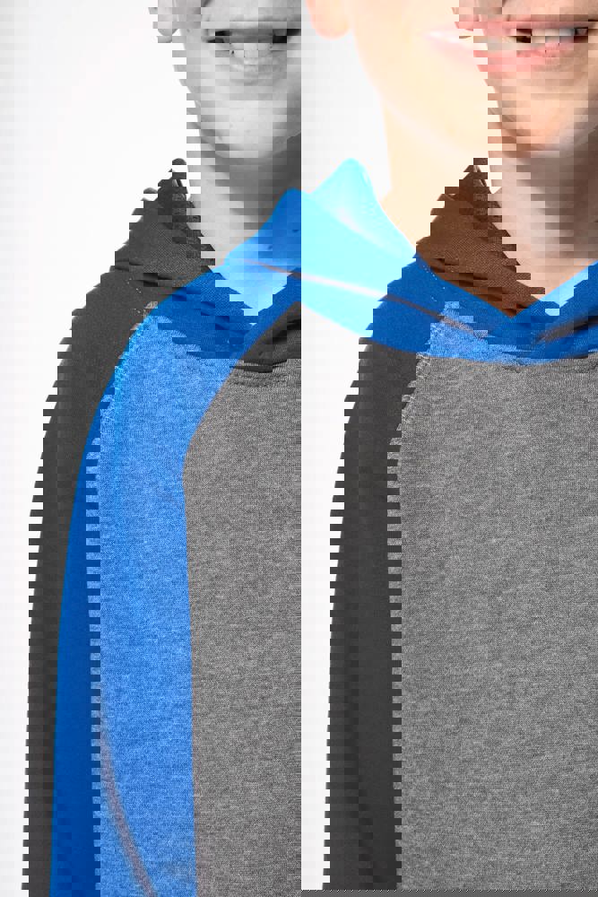 65 % Polyester / 35 % Baumwolle. Gebürstetes Fleece. Kontrastfarbene Raglanärmel und Kapuze. Gefütterte Kapuze aus Ton-in-Ton-Netzstoff. Kängurutaschen mit neonfarbener Handytasche. Kopfhörer-Kabelführung. 2X2 Rippstrickbündchen an den Ärmeln und am unteren Saum.