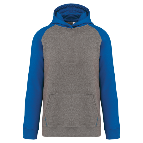 65 % Polyester / 35 % Baumwolle. Gebürstetes Fleece. Kontrastfarbene Raglanärmel und Kapuze. Gefütterte Kapuze aus Ton-in-Ton-Netzstoff. Kängurutaschen mit neonfarbener Handytasche. Kopfhörer-Kabelführung. 2X2 Rippstrickbündchen an den Ärmeln und am unteren Saum.