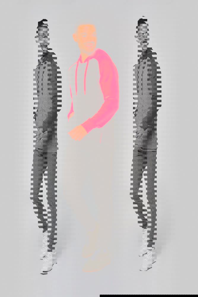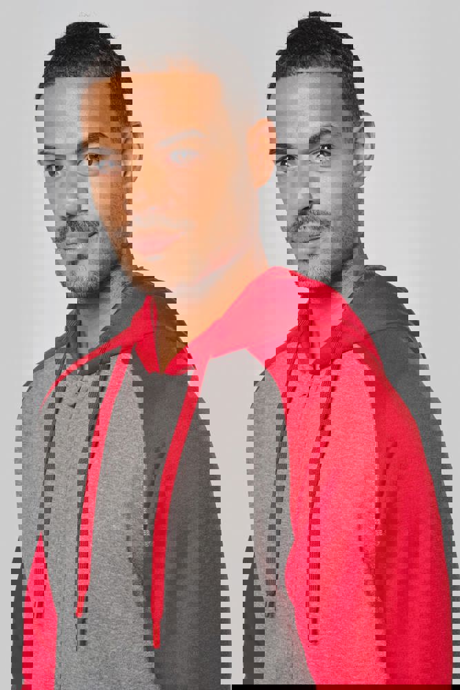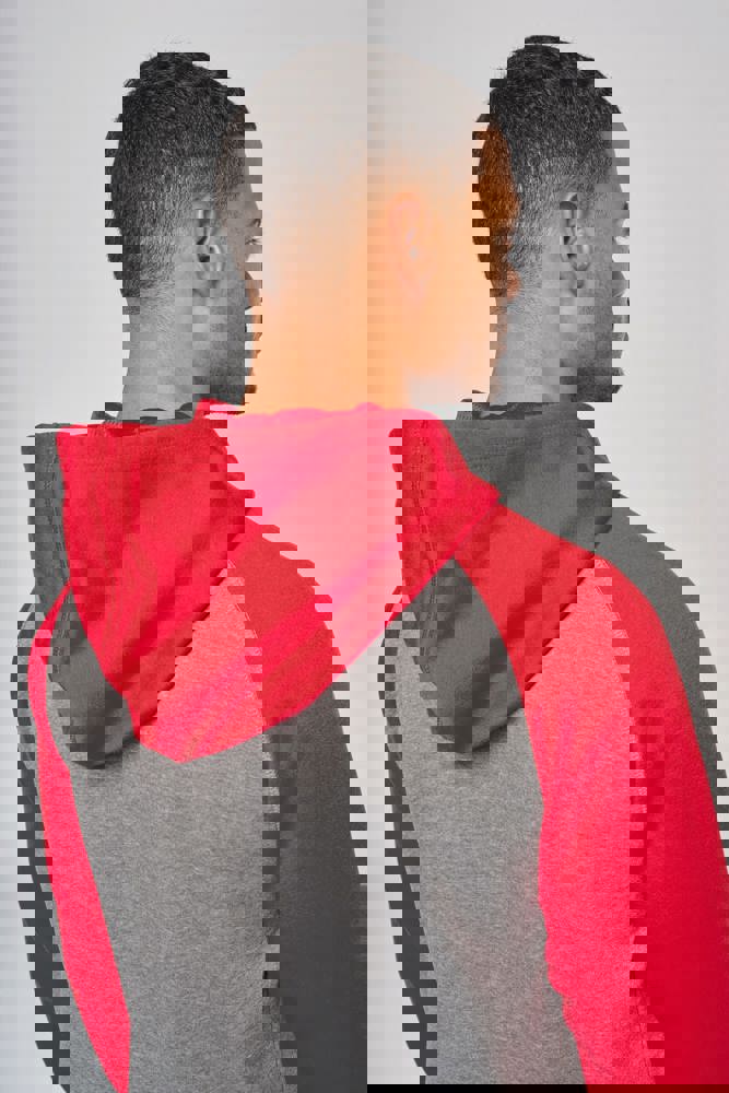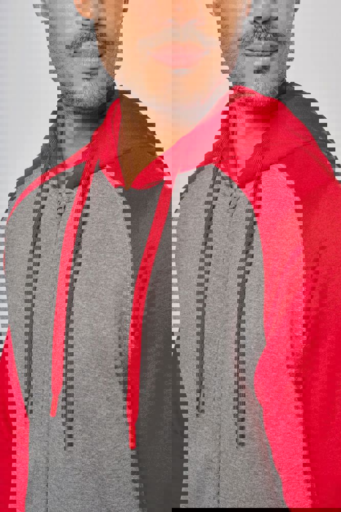 65 % Polyester / 35 % Baumwolle. Gebürstetes Fleece. Reißverschluss. Raglanärmel und kontrastfarbene Kapuze. Gefütterte Kapuze mit Ton-in-Ton-Netzstoff. Kängurutaschen mit fluoreszierender Handytasche. Kopfhörer-Kabelführung. 2 x 2 doppelte Rippstrickbündchen an den Ärmeln und am unteren Saum.