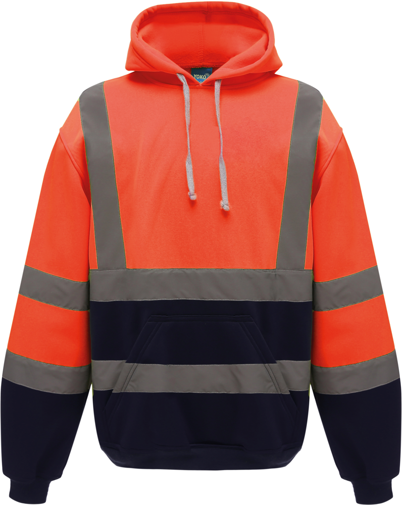 100 % pillingfreies Polyester. 2 reflektierende Streifen (5 cm breit) um Rumpf und Arme. Je ein reflektierender Schulterriemen. Nackenband im Halsausschnitt. Angesetzte Kapuze (in der Verlängerung des Halsausschnitts) mit Kordelzug. Eingesetzte Ärmel. Kängurutasche vorne. Strickbündchen an Ärmeln und Saum. Doppelnähte an Hals, Ärmelbündchen und Saum. Norm EN ISO 20471 Kategorie 3 : Hi-Vis Yellow, Hi-Vis Orange, Hi-Vis yellow/Navy, Hi-Vis Orange/Navy.